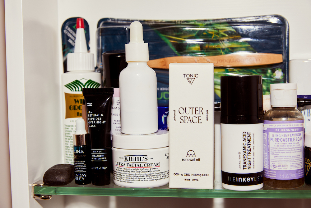 I don’t know why we started pretending that the Korean scrub towel is a new thing. I saw one on Instagram they were calling ‘The Mitt,’ and it was written in that heavy Helvetica people use when they want to seem like they’re not appropriating. Anyway, I’m a big believer in Korean scrub towels or gloves—the ones that clean your body until it squeaks. A squeaky body is a clean body. I like to use basic soaps, like Dr. Bronner’s or Molton Brown. I also have a really amazing CBD soap from Hollingsworth Hemp. Topical CBD can work, but it’s a matter of making sure you’re using the right stuff. When I’m finished I hit the towel once, and then put on liquid shea nut oil from Life Flo and vitamin E oil from Jason on the parts that get the most dry. After that I literally run around my house naked, air drying my body.