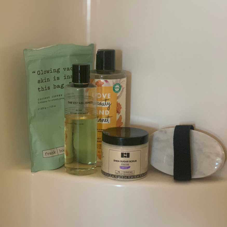 I dry brush once or twice a week, and I use a body scrub once or twice a week. I’m really into dry brushing lately. The one I’m using now I just got on Amazon, but I have one coming from Gilded Body that I’m really excited about. The scrubs I like are R&R Luxury’s Shea Sugar Scrub and Frank Body’s Coffee Scrub. I wash with the Love Beauty and Planet shower gel from Target or Olay—pretty basic. And then I get more into the body oils and moisturizers. When I get out of the shower I immediately put on The Established’s Elixa Bath and Body Serum and then layer their body cream on top. If I’m in a warmer climate, or it’s summer, I love R&R Luxury’s Shea Oil. Shea butter is hard, and you have to warm it up in your hands before you can use it. With shea oil, all you have to do is press the pump. It’s phenomenal. I started using this stuff last year—their US distributor is in Maryland, but it’s actually manufactured in Ghana.
