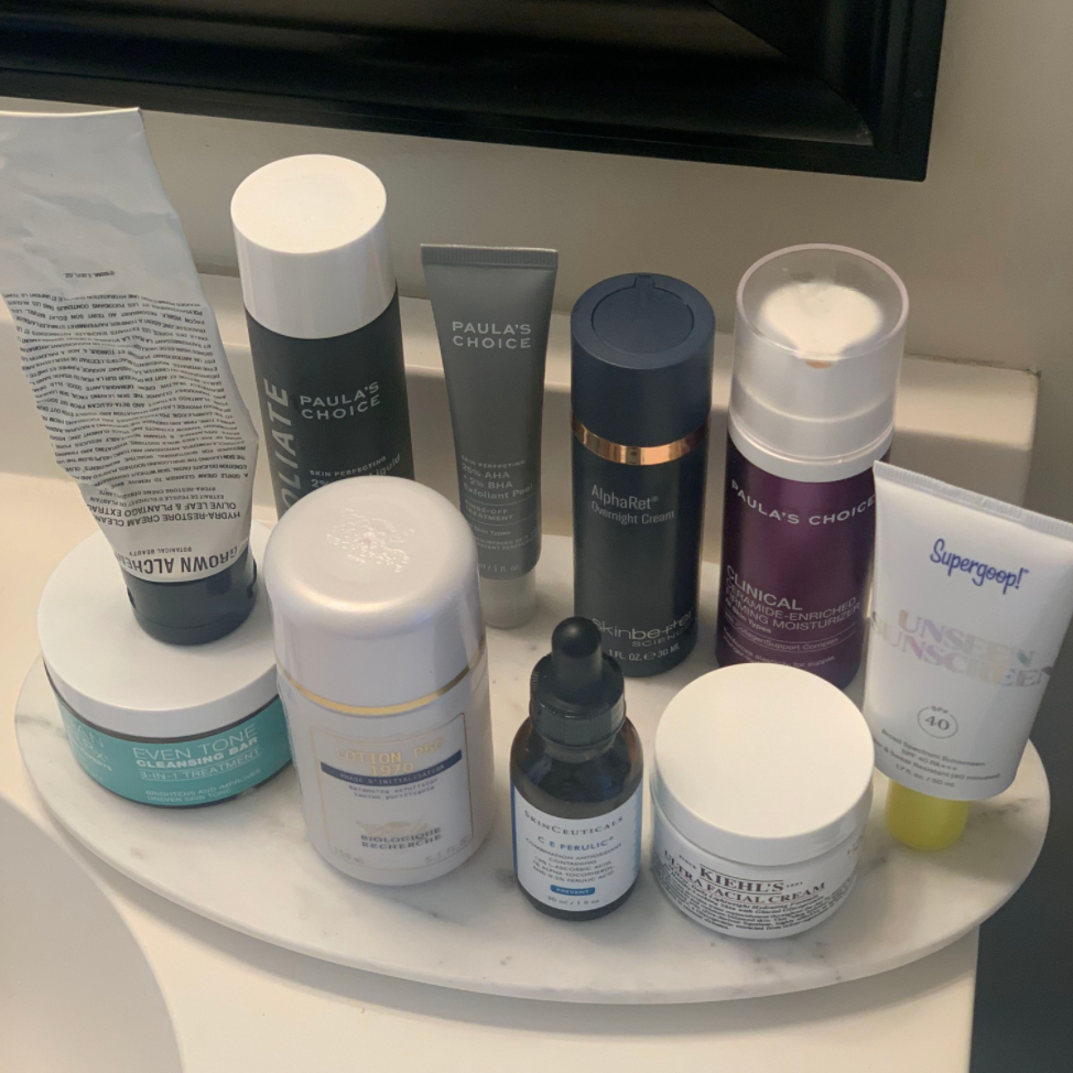 I love my complexion, and I feel like I have great skin—I’m not going to be humble about that. But there are some spots I’m trying to even out. In the morning I use the Urban Skin Rx Even Tone Cleansing Bar, which has kojic acid and azelaic acid. My skincare Batman and Robin are Biologique Recherche’s P50 1970 and Skinceuticals’ C E Ferulic. I love them so much, and they’re both holy grails for me. My moisturizer is next, and I’ve been loving the Kiehl’s Ultra Facial Moisturizer and Bolden’s Brightening Moisturizer with SPF 30. If I use the Kiehl’s I also put on Supergoop’s Unseen Sunscreen, which never leaves a cast. I struggle with finding a mineral sunscreen, even though Kinship’s is my favorite of what I’ve tried.