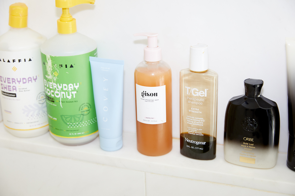 Jenna Perry just cut curtain bangs for me at her salon in the East Village. But I don’t color my hair—I got highlights once a couple years ago, and it turned orange. I was like, ‘Never again.’ I’ve gone on a journey recently because I have a dry scalp and a naturally frizzy-wavy texture. I have this fancy comb from Leonor Greyl that feels so good on my scalp, and my dermatologist recommended I use T Gel from Neutrogena in the shower. I always have that in case my scalp starts acting crazy, and I’ve also been using this Oribe Gold Lust Repair and Restore Conditioner. I wanted to find a product that would make my hair look good when it air dried so I asked my followers for recommendations. The one that kept coming up was the Ouai Leave-in Conditioner, which has been great for the task. But the one that I always return to is the Bumble and Bumble Don’t Blow It Thick Hair Styler. If I put it in when it’s wet and let it dry, my hair will look so freaking good. I’ve recommended it to so many people. I’ll also put the Gisou hair oil on my ends. I only wash my hair like twice a week, so the Batiste Hydrating Dry Shampoo is essential between washes.