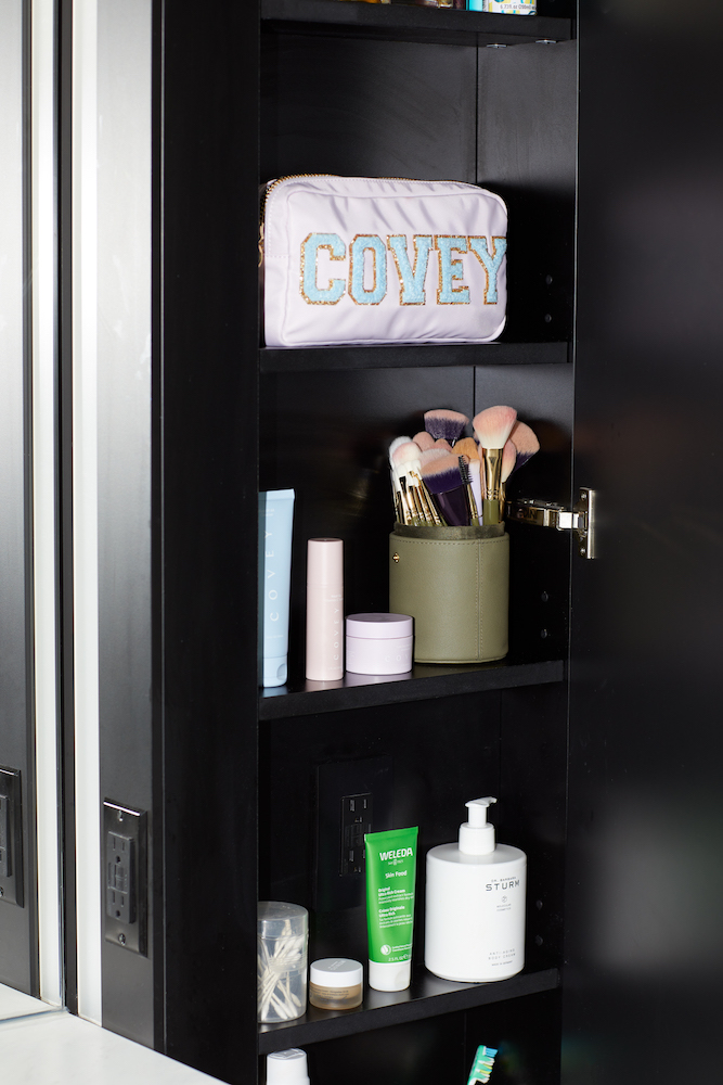 I wanted a cleanser that didn’t strip my skin or make it feel dry, but it also needed to take off all of my makeup after a shoot. When we were formulating Covey’s cleanser, I would film myself washing my face with each lab sample to see if it took everything off. If it didn’t, we went straight back to the drawing board. The one we ended up with takes off all of my makeup and leaves my skin feeling hydrated but fresh. Then, I use our Vitamin C serum. Before Covey was even a thing, my business partner and I both asked Dr. Russak what we need in our skincare routines. She said vitamin C serum, because it protects from free radicals, helps produce collagen, and brightens dark spots. I went on a rampage trying every single Vitamin C serum on the planet, and they were either too sticky or too harsh. And L-ascorbic acid made my face smell like ham—it drove me insane. For Covey’s we used THD ascorbate instead, which is a better penetrator than L-ascorbic and has no smell. We also have vitamin E and grapeseed extract in there, which gives it a milky consistency. It’s so different from other vitamin C serums and never leaves me with irritation.