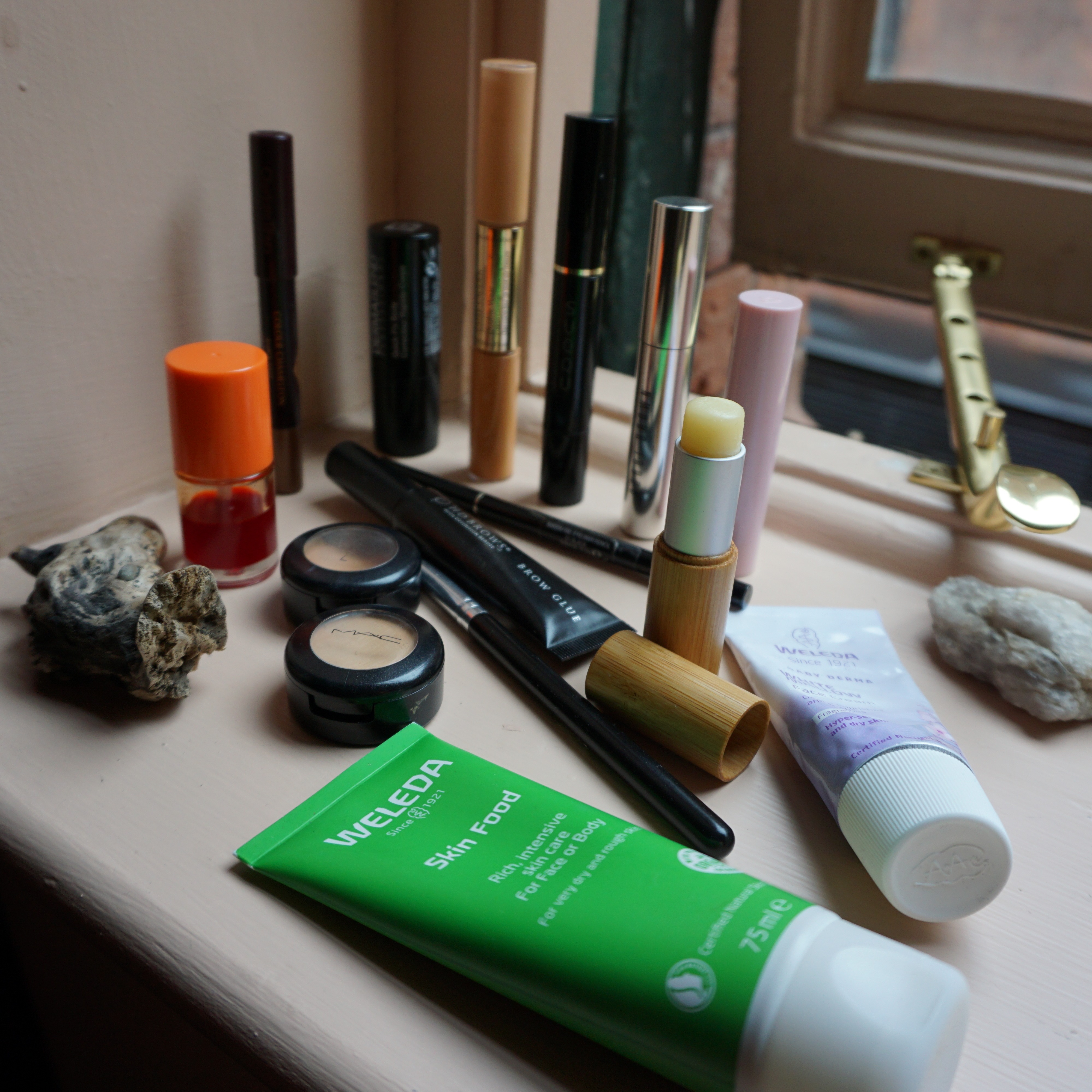 After I moisturize, I apply Glossier Futuredew and Estée Lauder’s Double wear Custom Coverage Correcting Duo in Tangerine under my eyes, around my mouth, and on the sides of my nose. That stuff is discontinued now, but I stocked up. On top, Suqqu’s Radiant Cream Concealer in No. 2 is moisturizing and doesn’t crease, so it’s good to use under my eyes, and I blend MAC’s Studio Fix Concealer in N30 and N42 around my mouth and the sides of my nose. The sides of my mouth are especially prone to hyperpigmentation in the summer, so I use Dermablend Quick Fix Body Stick in 40 Medium there and anywhere I have dermatitis. After that, I have quite a few foundations I go between, depending on how tan I am. I have a bunch of shades of Bobbi Brown’s Foundation Stick: Beige, Golden Natural, Golden Honey, and Golden. I also have Nars Sheer Glow in Stromboli, which works for most of spring. It all depends on whether I’ve been home to Sydney or not. For blush, I love Bobbi Brown’s Pot Rouge Cabo Coral [Ed note: discontinued]. And if you're South Asian and sometimes find your lips turning a cool, dark purplish color after a bit of sun or cold exposure, Etude House’s Dear Darling Water Tint in Orangeade is excellent at neutralizing that. It stains all day and can be worn alone or under lipstick to prevent ashy tones from coming through. I use it with Glossier’s Ultralip in Fête on top—it’s moisturizing, and a little goes a long way. My brows need heavy duty taming so I use HD Brows Brow Glue, and for my lashes I like using Bobbi Brown’s Smokey Eye Mascara after I’ve curled them. If I’m going out I’ll add a bit of Charlotte Tilbury’s Color Chameleon in Amber Haze