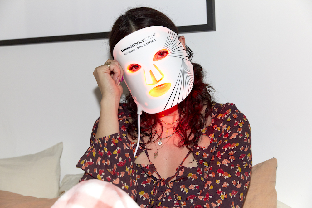 After that I’ll either use a 0.025-percent tretinoin prescription or Skinceuticals Retinol 1.0 Night Cream. 'Medical-grade skincare' means absolutely nothing, it’s a marketing term, but Skinceuticals does use some of the same techniques that are used to make prescription products. I wish they explained that better, because it’s really cool. Their retinol is encapsulated, which increases stability, but it’s also nitrogen-filled—they basically shoot some nitrogen into the top and it gets all of the air out of the tube. After retinol I use Deliverance again, because the peptide we included works better when it’s applied twice a day. I had a very severe issue with perioral dermatitis in my 20s because of essential oils, and I haven’t had a perioral dermatitis outbreak in a really long time. But if I do have a rash Deliverance helps with that too. I had one of my worst outbreaks the day I happened to be meeting Joyce to finalize our cannabinoid complex encapsulate, and it literally brought down the redness and blotchiness in hours. It’s not going to do that for every issue—like, if it brought down rosacea that quickly pharmaceutical companies would be knocking down our door. But it’s really effective for me. I’ll use my Dieux eye masks with the Dr. Loretta Tightening Eye Gel for a while, apply a rich cream again, and then I’ll use an LED thing while I listen to Maintenance Phase. I’m obsessed with that podcast right now. At home I usually use my Celluma Pro, which has a mix of red and blue lights, and take the red light Currentbody Skin mask when I travel.