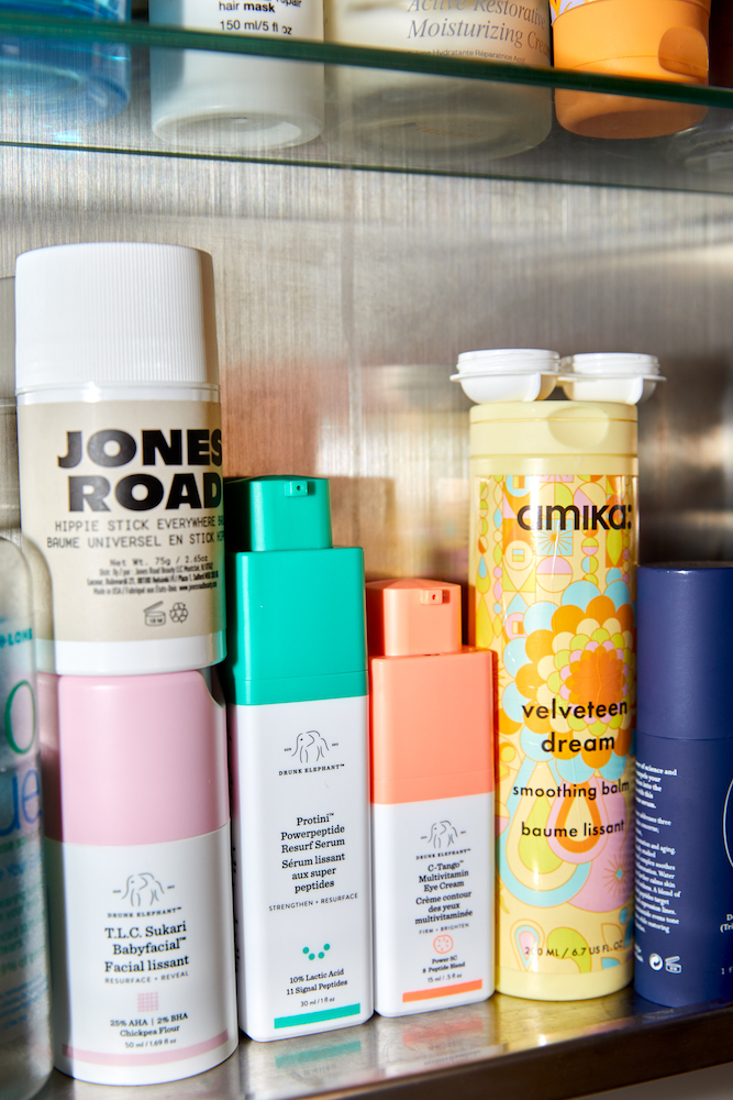 Sometimes I’ll use this Dieux Deliverance Trinity Serum. I don’t love having a lot of product on my skin, so I don’t use many serums, but this one absorbs really well. And I think it helps a lot with inflammation—especially when I’m starting to get my period. It’s good for hormonal acne. Then, I use this Drunk Elephant Virgin Marula Oil. I started using face oils maybe two or three years ago—the first one I really liked was the Circumference Pure Balancing Botanical Face Oil, which was also from Mi-Anne. I gua sha, and massaging in a good oil feels really nice. When I do that, I don’t have to do as much work in the morning. I just wake up and my face feels moisturized. In the morning I’ll just wet my face and use this Tata Harper Water-Lock Moisturizer. I’m really obsessed with it. I found it when I was in California, because it’s so dry there and I really needed a good moisturizer. I’ve been using it a lot since. Then I’ll use this ZitSticka Megashade Sunscreen Serum. It’s creamy, which makes me feel like it sinks in more quickly, and it’s very lightweight, so I’m not totally aware that I’m wearing sunscreen.