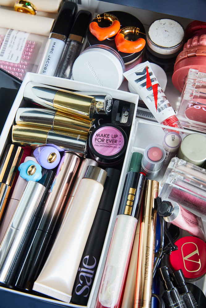 Now that I’ve kind of gotten the hang of beauty, I feel like I can experiment more and really elevate an outfit. It’s like an accessory. But sometimes I think, ‘Oh man, this look is complicated and crazy enough that I should keep the makeup simple.’ So either I’m doing a full look, or I’m not wearing makeup. I use Glossier Futuredew as foundation, basically—it evens out my face and makes it glowy enough. Then I use this reddish Milk Makeup Quirk stick for my cheeks, and Saie’s Dew Balm as highlighter. Cream highlighter is so much easier to blend in than powder.
