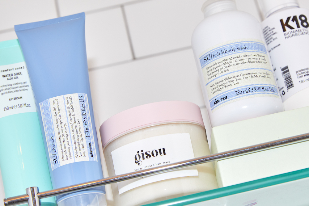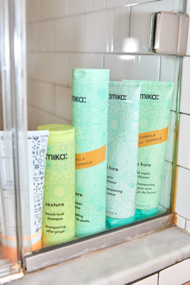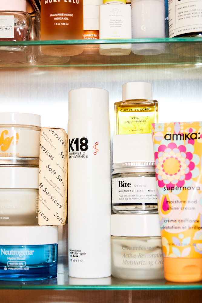 I’m so loyal to Colleen because at this point, we’ve been doing it for so long. She knows that I like a dusty pink that’s not too purple. We don’t talk about it, we just do it. My first appointment took like seven hours, because I had to go platinum before I went pink. But now I get my roots done and the pink touched up once a month. If I don’t see Colleen for a while, then I’ll use an Uberliss Bond Sustainer in Pink Rose to re-up on the pink. I wash my hair twice a week with purple R+Co Sunset Blvd Shampoo, which keeps the pink from getting yellow. Then I actually don’t use conditioner, because I use K18. That has been such a game changer for my hair. I thought that bleaching it for so many years would leave it brittle, but it’s totally fine. It honestly feels so soft and shiny. I’ve tried a good amount of hair masks—my favorite is the Amika one because it smells so good, and I do use their Supernova Hair Moisturize and Shine Cream every time after I shower. But if I want to actually repair my hair and make it feel better, it’s the K18.