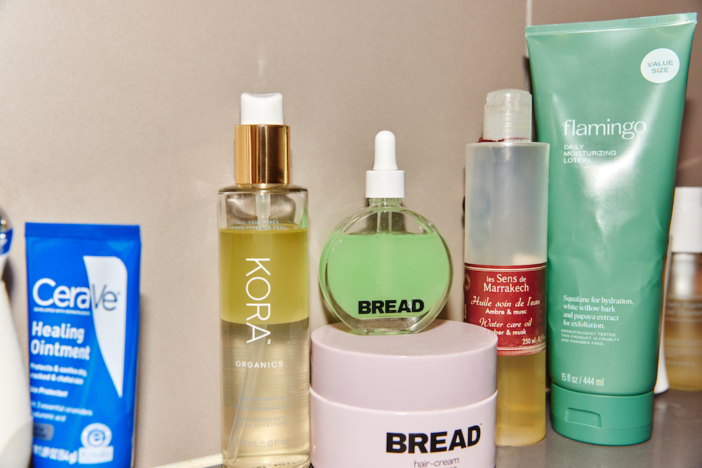 If I have an extra minute or so when I’m done, I use this Moroccan in-shower gel that I got in Senegal. It’s nameless—I found it in the airport. You drip it over your body so you don’t really have to moisturize when you come out. It’s so beautiful, smells like amber and hazelnut, and feels so luxurious, like a hammam. When I don’t do that, I’m using body creams. A lot of whipped creams, like the Hanahana Beauty Shea Butter, and a tub of shea butter that I got from Senegal—a concoction of cocoa butter, almond oil, and shea butter, raw. I love a good lotion, though there aren’t many I use. I’ve actually been using Flamingo’s lotion. It’s so good! The way it slips on the skin, the way it dries down, the way I’m not ashy afterwards… I’m on tube three.