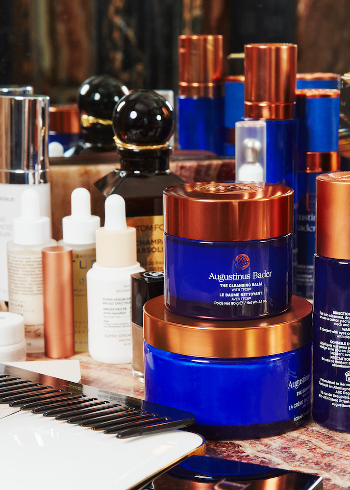 To wash my face, I use Augustinus Bader Cleansing Gel. I love that it’s gentle and not very drying. I see a difference from his products, for sure. I also use The Rich Cream, and his Body Cream. I have several different serums—at night I use the Skin Medica TNS Advanced Serum, which is great for skin texture. I’ve been using that for years and I really love it. In the morning I use the Skinceuticals CE Ferulic, which is a great antioxidant. That’s more for anti-aging. Another serum I use once a day on my face and neck is the Biologique Recherche Serum Yall O2. It really helps with any fine lines and is a great renewal product. Before I apply cream, I put on my May Lindstrom Garden Botanical Face Mist to give it some water to hold in. It smells amazing, and it’s super refreshing. I also carry it with me and use it a lot throughout the day. I put the Biologique Recherche Creme Contour des Yeux VIP O2 around my eyes—I love that it’s in a stick and that I don’t have to put a finger into it. And everywhere else, I use the Auteur Definitive Restoration Cream, which is super moisturizing and has a really nice texture. I’ve been using that for about eight months. I use the Skinceuticals Physical Fusion UV Defense SPF 50 last every day. I don’t wear makeup often, but when I do that’s also a great base. It isn’t greasy, but has a lot of sheen.