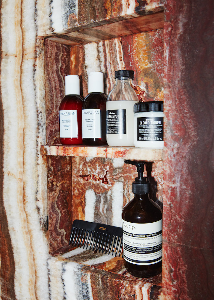 There’s a Detox Market here in LA, and I like to go there to get Pai’s Comfrey and Calendula Calming Body Cream. It’s super luxurious and it really is moisturizing. It has a nice texture to it. I dry brush almost every day. And in the shower, I use the Mustela Gentle Cleansing Gel. It’s for babies—maybe that’s weird, but the smell reminds me of when my boys were little. It’s super non-drying and simple. I also love baths. I took baths with my boys until they were probably five or six years old and we could barely fit in there. My husband was like, ‘Time to cut the cord here.’ [Laughs] But it was just the best time. We would talk and laugh and play games. But anyway, I love baths and try to take one at least once a week. I love the aromatherapy of essential oils, and have a bunch of different Pranarom ones: eucalyptus, rosemary, cinnamon bark… I like to mix it up.