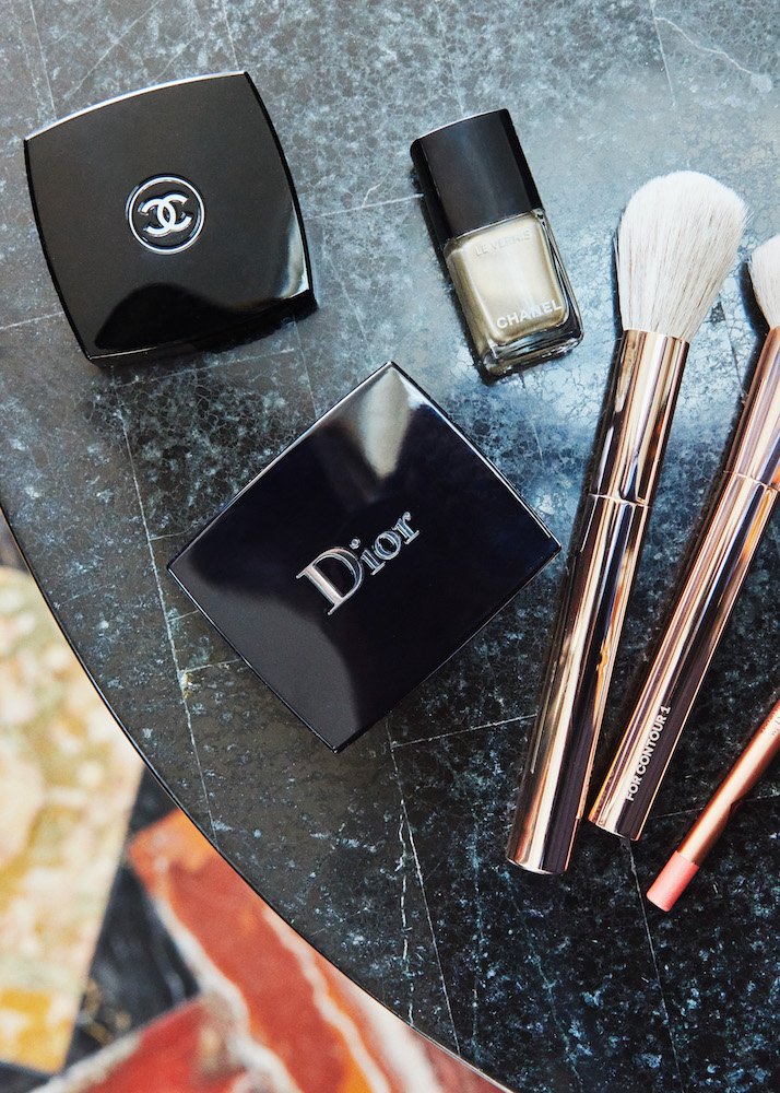 I have thick brows and they’re kind of dark already, but I fill in a couple little holes with the MAC Eye Brows Styler in Spiked, an espresso color. I kind of spot-treat with it. And if I am going to be out for the day, I’ll use the Anastasia Beverly Hills Tinted Brow Gel to keep my brows in place. After that I use an eyelash curler, which is by Kaasage, and then Kevyn Aucoin Volume Mascara. I work out during lunch, and I don’t have any issues with that stuff smudging. If I have a meeting and have to look extra polished, I’ll use the Dior 5 Couleurs Couture Eyeshadow Palette in Cruise 022 [Ed note: shade discontinued]. [The shades] are all neutral with a slight peach-y tone. I don’t really wear lipstick, but there’s a lip liner that I like, Charlotte Tilbury Lip Cheat in Pillow Talk, which is literally the exact same color as my lips. Then, I’ll use this really amazing neutral lip moisturizer on top of it, Augustinus Bader’s The Lip Balm. That’s my day lip balm that I keep in my purse, and at night I use Dr. Hauschka’s Lip Care Stick. I’ve been using that for as long as I can remember. I just buy it at Erewhon.