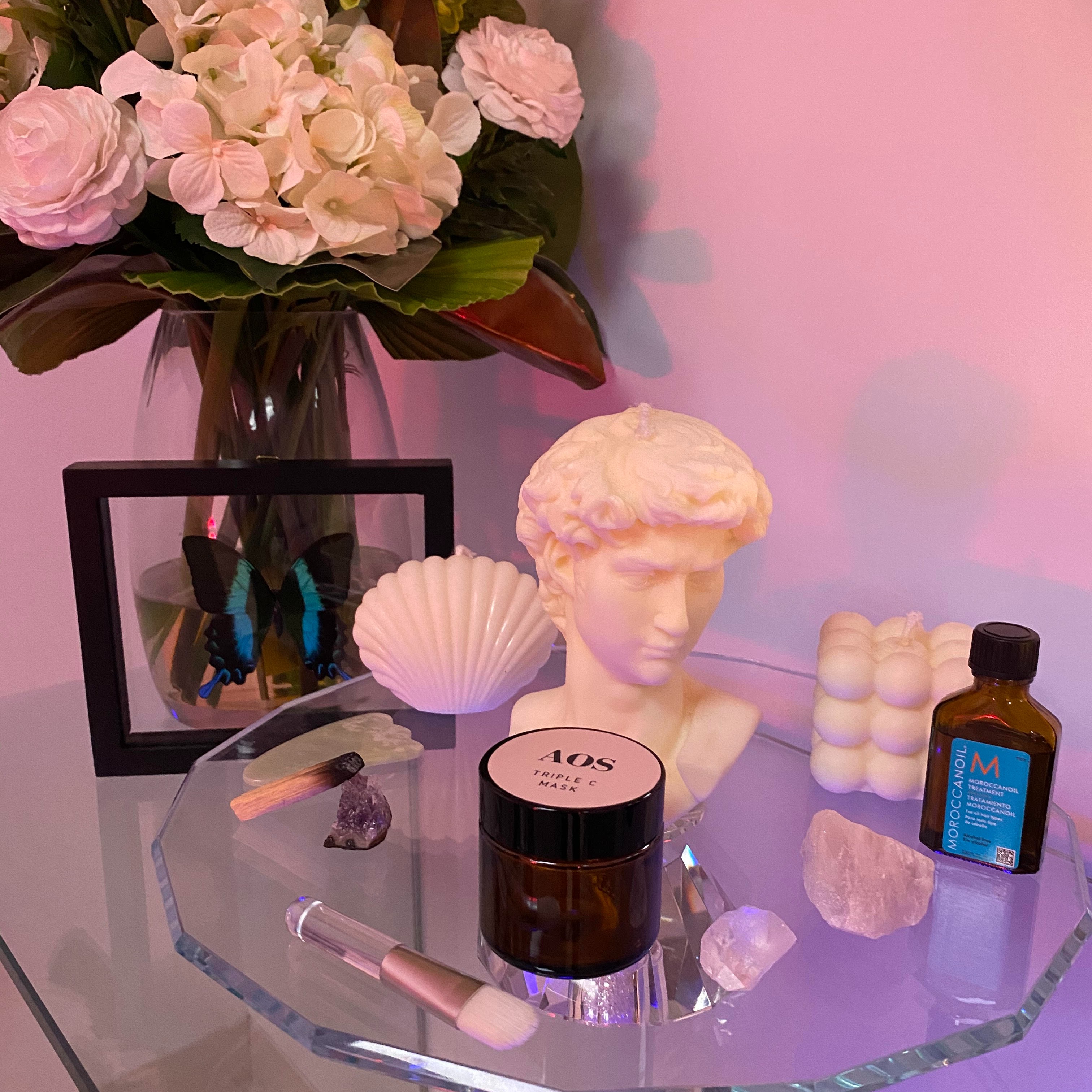 I just moved to West Hollywood a few months ago. Friday is my day off, and I love to hit my favorite neighborhood spots. I get my nails done once every two weeks at Butter Nail Salon—I wish I could go longer in between appointments, but because of my work, I need fresh manicures regularly. I go to an amazing pilates class called Forma Pilates that my friend and client Liana Levi created. It is the hardest class I’ve ever taken but it is so rewarding and the trainers are incredible. Then I’ll grab an Iced Vanilla Oat Milk Latte at Alfred and head home to relax. If I really want to relax, I’ll put on a feel-good playlist (Renee by SALES and Wellenlänge by Rezident definitely included), run a bath, pop a bath bomb and some vitamin E oil into the water, light a Voluspa candle, and smoke my Sherbinskis CBD pen. I’ll also put on our AOS Triple C Mask, which is my favorite for maintenance. It’s hydrating and cooling, with hyaluronic acid and antioxidants. Once I get out I’ll sit under my Lightstim Pro Panels for up to a half hour, while listening to an audiobook or podcast. And when I can use my eyes again, I’ll watch an episode of Maid. So amazing.”