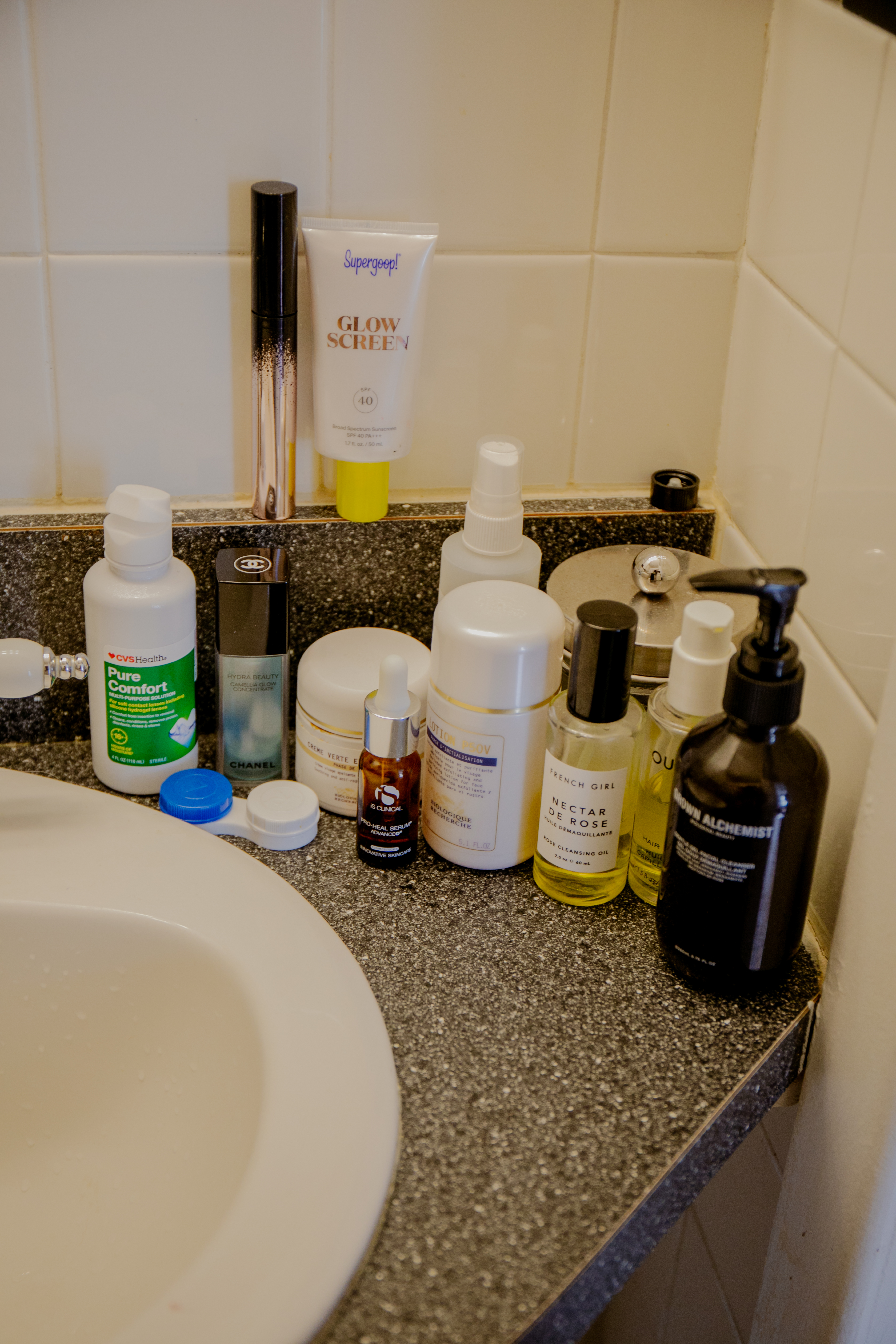 I have a working from home routine, and I have a going into the office routine. Going to the office, I wake up and I start to think about what I’m doing that day, what kind of appointments I have, what kinds of meetings I have, and things like that. I take a shower pretty quickly when I wake up. I do a double cleanse, so I do an oil face wash and then I do a more soapy face wash. I use French Girl Beauty Oil Cleanser. I’m a sucker for a pretty bottle, and I like things that look medicinal. I like things that look and smell like in the 1920s, a doctor smoking a cigar would be like, “This is quite good for you!” The French Girl Beauty, to me, looks sort of like that. Then, I use this cleanser by Grown Alchemist. My skin tends to get a little red, probably because I don’t drink enough water, so I’ve found that it’s actually quite good at calming my skin. I’ve recently switched to a spring moisturizer, which is a moisturizer by iS Clinical and their Pro Heal Serum, which is what my facialist at Rescue Spa recommended. Then, I have a Biologique Recherche Creamthat also reduces redness, which I’ve found to be super effective. In between doing all of this, I am mainlining enormous glasses of ice water. Then, I put on sunscreen. I use Supergoop—sometimes I use the tinted one, which is really great. It gives you a nice glow. Then, sometimes I use the invisible one, which is also pretty good. Then, I get dressed and I go into the office.