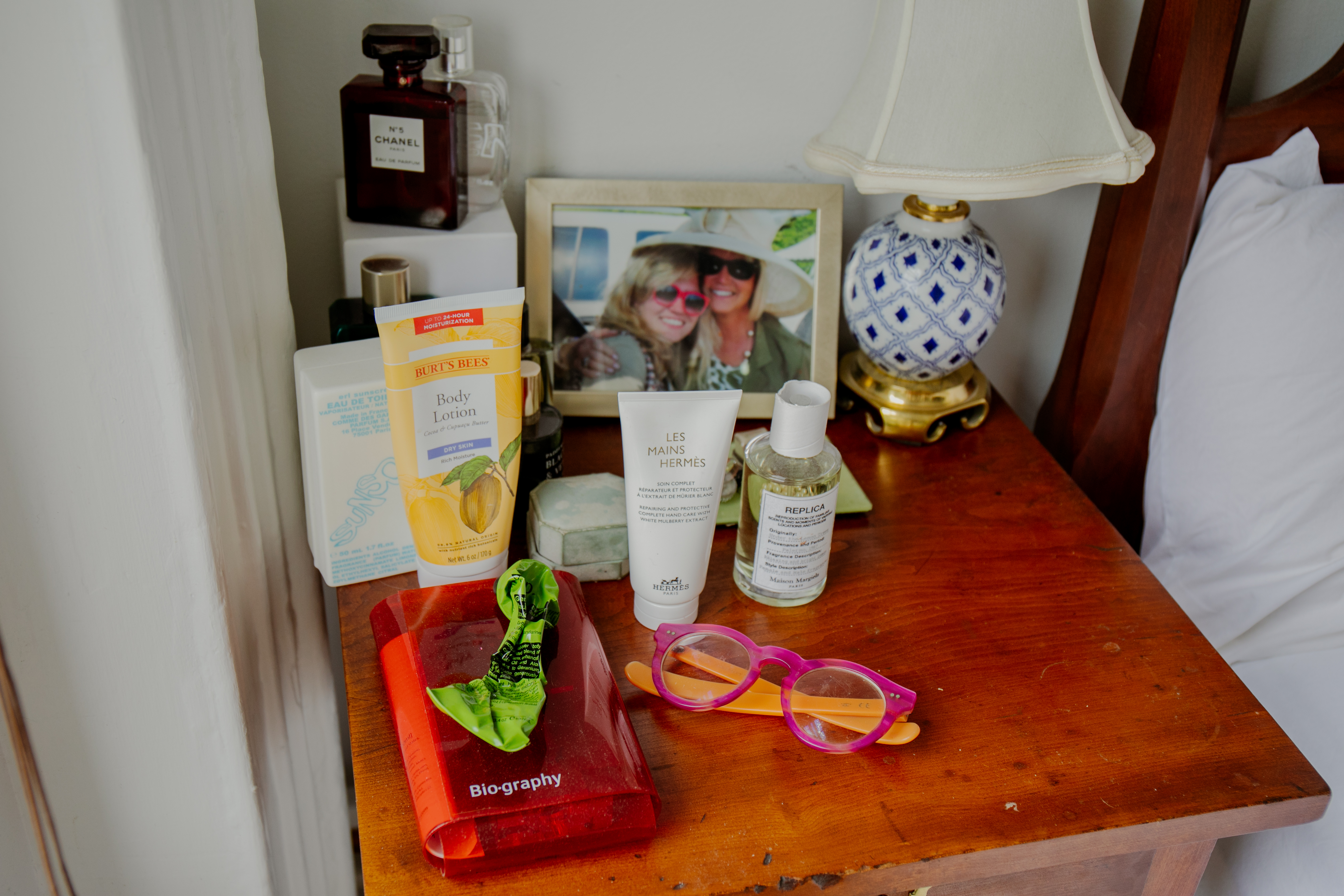 I always use a lotion. Right now, I’m using an Aesop lotion that’s geranium scented. I bought it, of course, going back to the attraction to these packages. It comes in that really old-fashioned metal tube, which is what toothpaste came in when toothpaste was invented. Sometimes, if my skin feels really dry, I’ll put body oil on top of that.