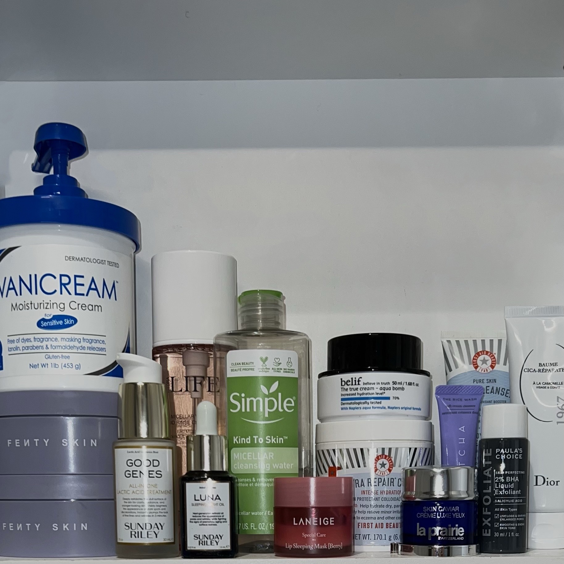 For my skincare, I use Cetaphil Daily Facial cleanser; from there, I either use the Simple Kind To Skin Micellar Water or the Dior Hydra Life Micellar Water to remove any excess makeup. For daytime, I use the First Aid Beauty Ultra Repair Cream or Belief The True Cream Aqua Bomb and EltaMD on top for the days I am outside and in the sun. My skin is super sensitive and does not need much, so I try to keep it light and simple for the daytime.