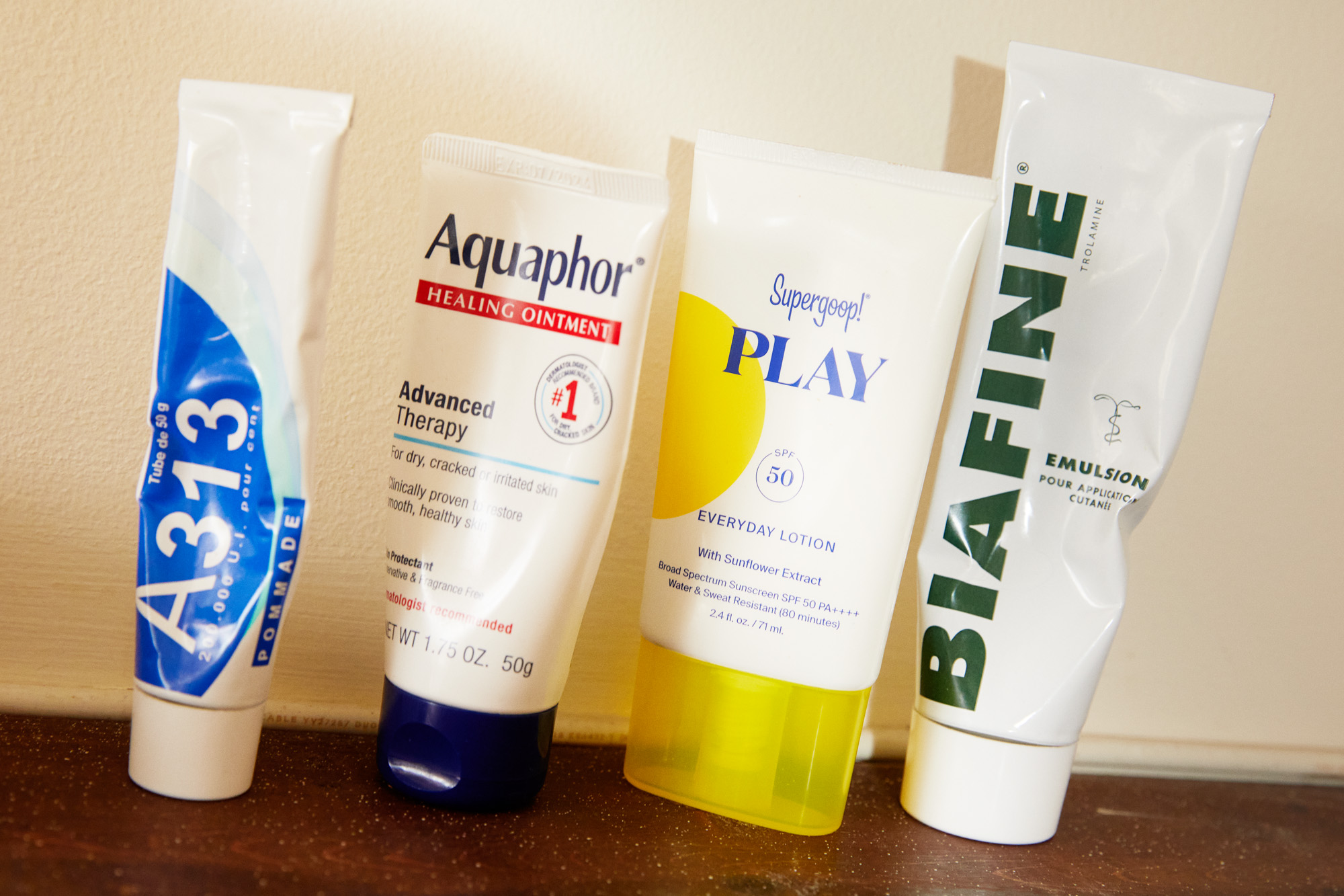 The cleanser that I like when I’m having a leisurely process is from Ayond—the Metamorph Cleansing Balm. It has a grainy oily texture, and it melts on your skin. It’s just so lovely. I have a niacinamide product—Alder New York Balancing Serum—that I’ll throw on sometimes, and I’m also using a serum that I quite like. It’s the Nature of Things Balancing Facial Essence. I love their little jars—the product is great, but when things look good, I’m a sucker for it. Then I will use A313; I’ve tried tretinoin before, and it makes the skin around my eyes very, very sensitive. After, I like the Stratia Liquid Gold or Biafine—another French pharmacy staple—as a moisturizer, and I’ll throw Aquaphor on as an occlusive.