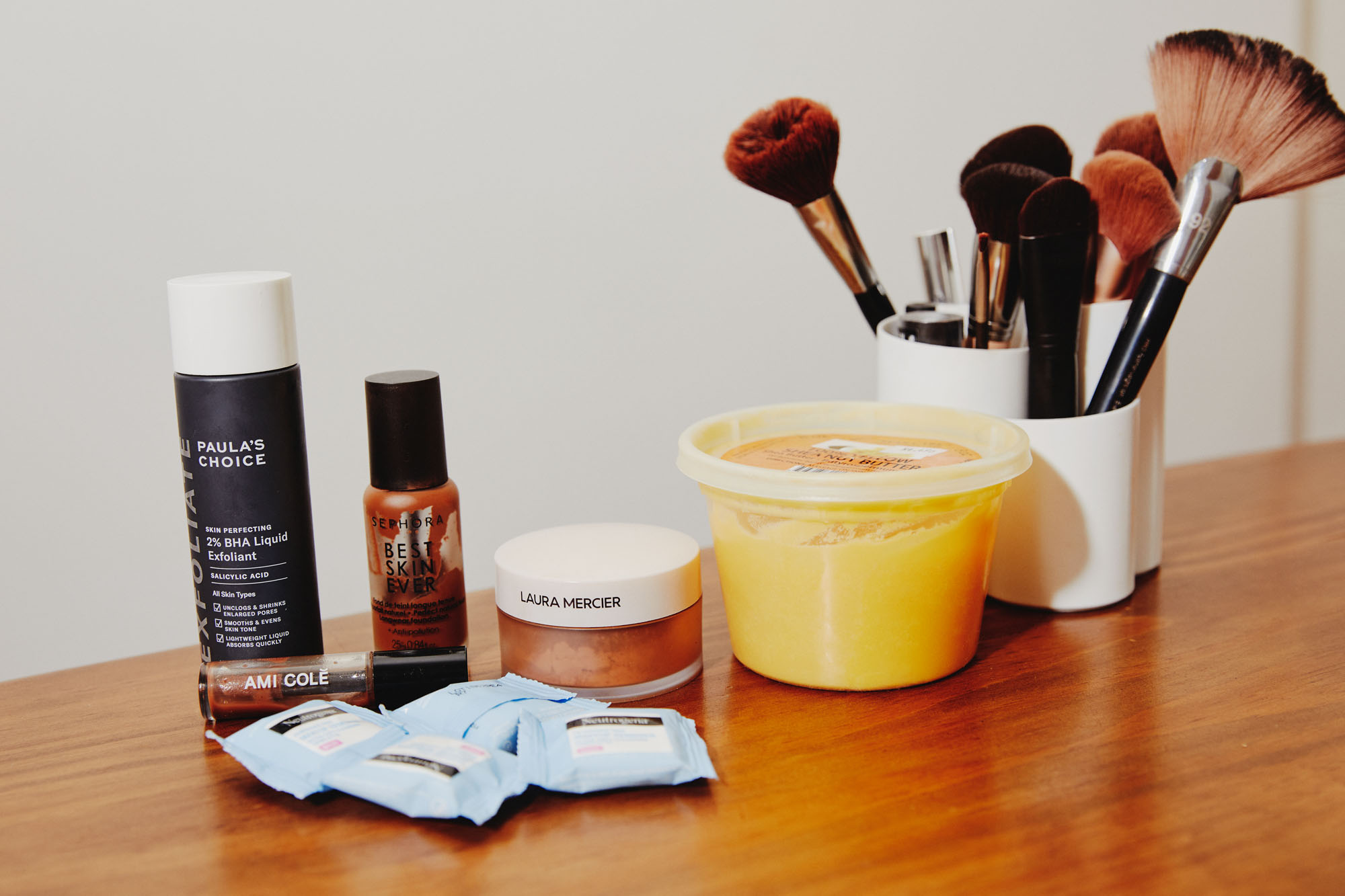 I use the Benefit POREfessional Face Primer just on my T-Zone. Then I use the Armani Luminous Silk foundation in shade 15. It’s the OG—can you get any better than that? It’s medium coverage but light, and I love the color. My skin has a red undertone and I’ve found that a lot of foundations are too yellow-brown, even when they are deep. My Armani shade is almost a deep red, which I like. In the winter, I use the Sephora Best Skin Ever Foundation more because it’s a bit more full-coverage. Depending on what kind of day I’m having, I can very easily be done there, but if I’m doing more, I’ll use a combo of Fenty Beauty Bronzer in Toffee Tease and Laura Mercier Translucent Powder in Medium Deep to contour—but I rarely do.