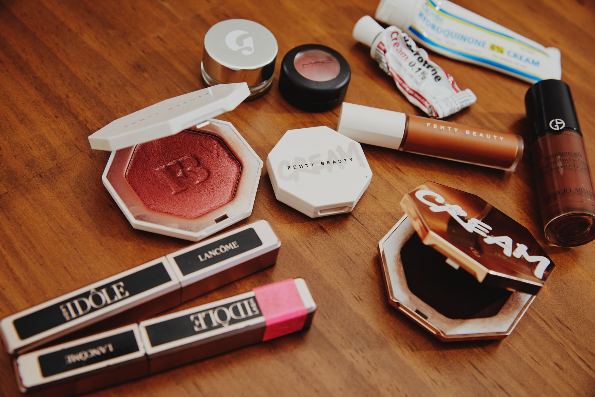Sometimes, not always, I do a little bit of concealer under my eyes and in my smile lines. Right now, I’m using the Fenty Beauty Pro Filt’r Liquid Concealer in shade 440. I don’t know if I’ll buy it again, not because it’s not good but because I like to play. So far it’s been fine, but I also don’t really like using concealers in general to be honest. Although, the Glossier Stretch Concealer (in shade G2) [note: the shades have since expanded and have been renamed] will forever be my girl—it’s Glossier’s hero product for me. The only reason I haven’t been using it is because I ran out. It’s creamy, and I like how light it is. I use it literally to conceal; I use the Fenty for brightening.