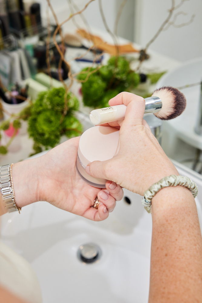 Every day, no matter what, I put on Saie’s Slip Tint Moisturizer in shade Three—it has the right amount of glowy coverage. I was such a Laura Mercier Tinted Moisturizer girl for a long time, but this has become my contemporary version of it. If I want a little bit more glow, I’ll supplement it with Westman Atelier’s Vital Skincare Dewy Foundation Drops in Atelier II. If I don’t want more glow, then I’ll just go in with Westman Atelier’s Vital Skin Foundation Stick in Atelier II on top of it. I use it almost like a concealer to cover any areas where there's a little bit of redness. I usually apply it with a Sephora Collection Concealer Brush, but then I also go in with a Beautyblender so you don’t see any of the brush strokes.