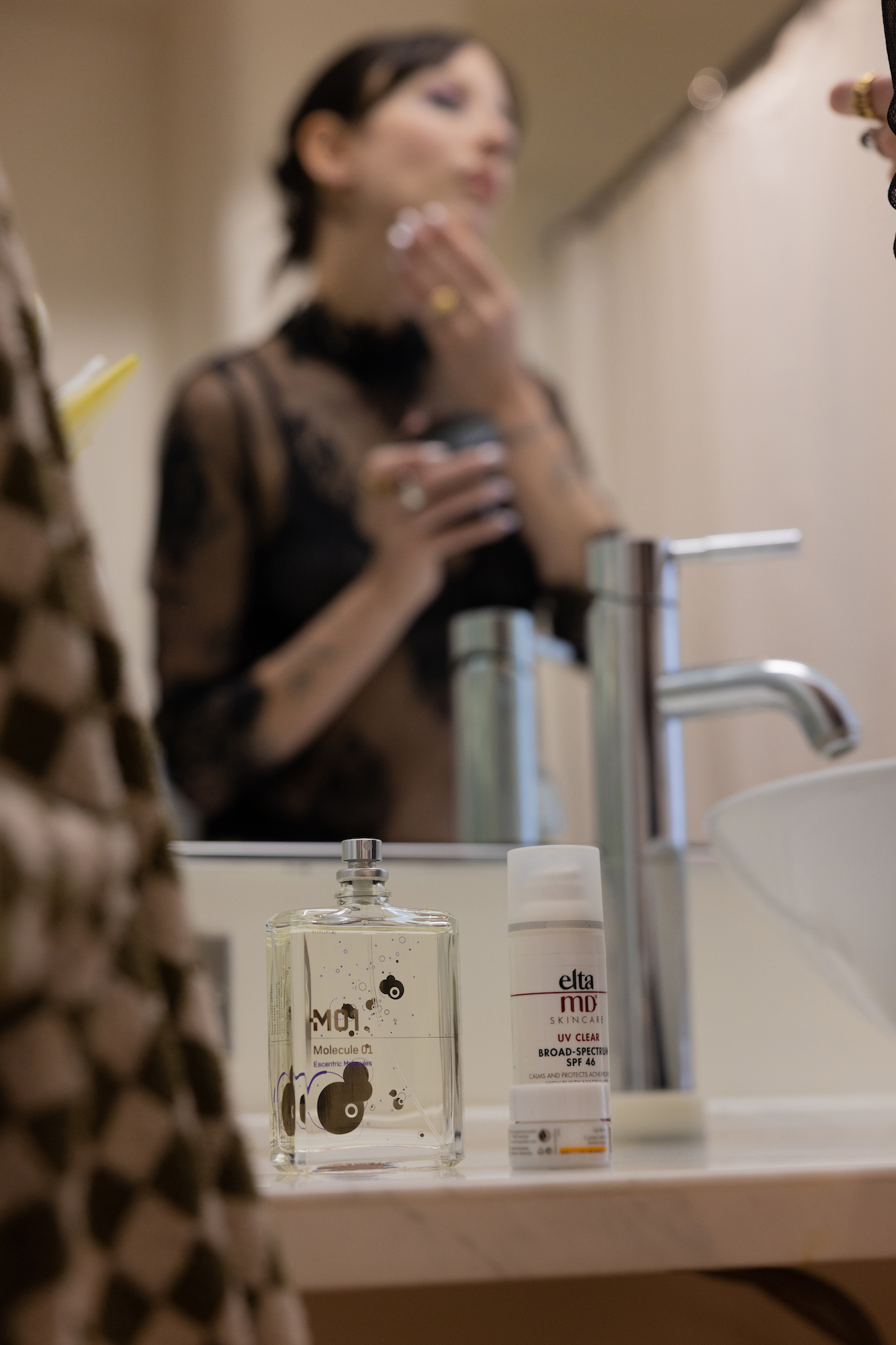 I have a pretty simple routine in the mornings. I clean my face with a very hot face cloth, and, while my skin’s still a bit wet, I apply EltaMD’s UV Daily Broad-Spectrum SPF 40. I love it so much. It’s not oily, and the minute you apply it, you already have this glow. From there, I go straight into makeup.