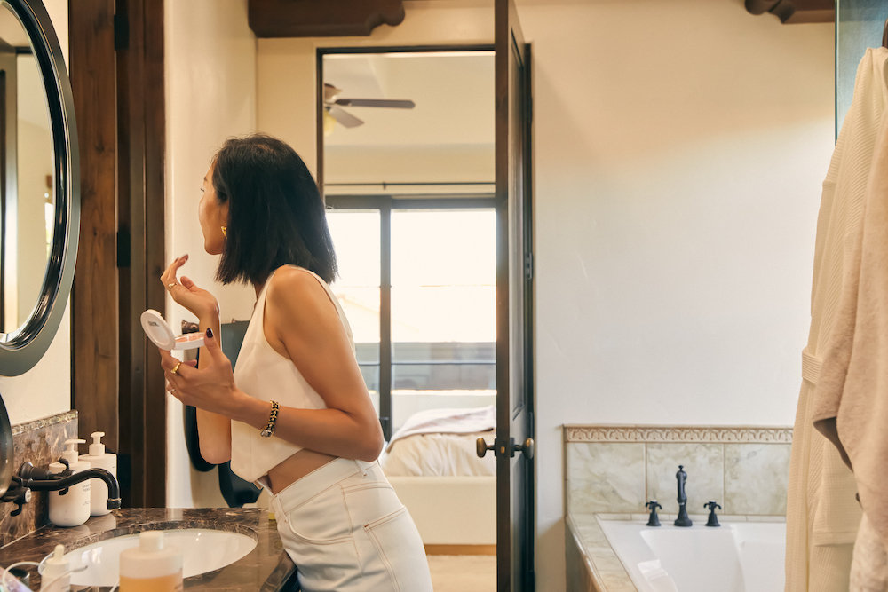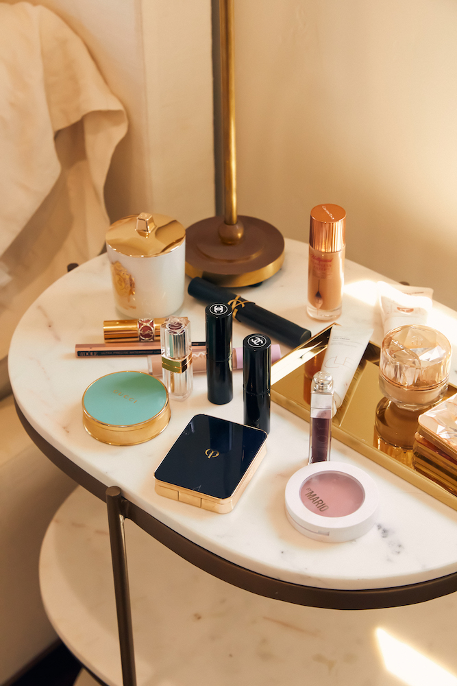 My goal is to have a really glowy and dewy base for makeup, so I always use an essence. I love MAKE Beauty’s Micro Ferment Rice Essence. I don’t like using face masks in the morning, but sometimes I’ll use a light one if I have a big shoot. I really love Augustinus Bader’s The Face Cream Mask. I’ll leave it on for about 10 to 15 minutes for an extra glow while I do my hair. And Clé de Peau’s The Serum gives me the craziest glossy skin. It’s hands down the one serum I’ve used year after year after year. I follow it up with Sulwhasoo’s Concentrated Ginseng Renewing Cream and sunscreen, of course. I use Supergoop!’s Unseen Sunscreen SPF 40 mainly because it leaves no white cast. I feel like it kind of blurs my pores, too.