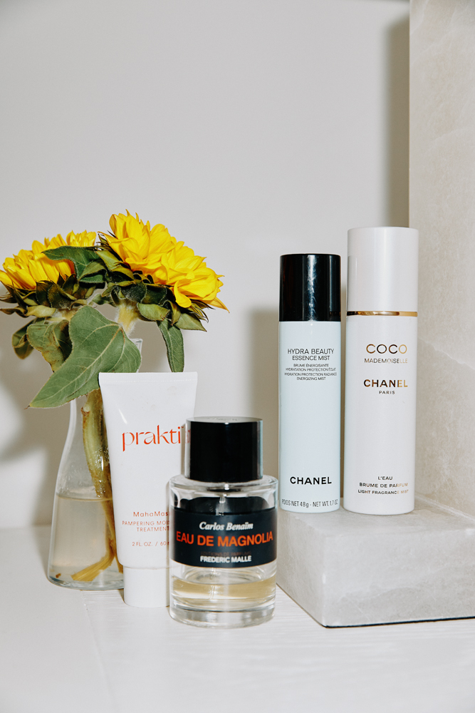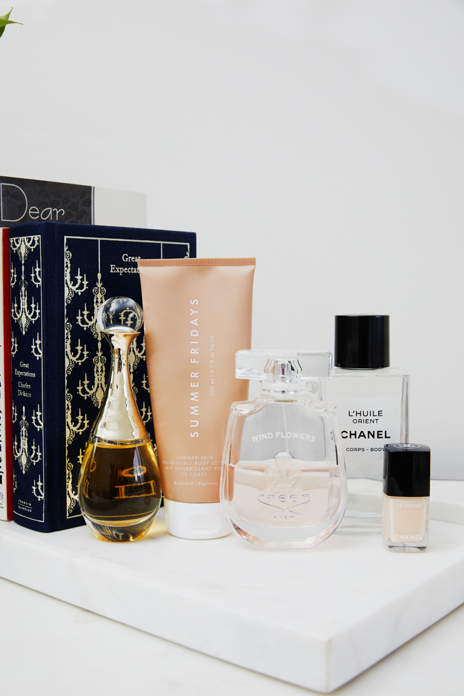 I use Summer Fridays’ Summer Silk Body Lotion right after I shower. It smells amazing, and it moisturizes without making you shiny. It has the best texture, too—kind of cushiony. I like using Chanel’s L’huile Orient Body Oil all over, too. It’s nice because it absorbs right away and doesn’t feel greasy. It’s so light. Sometimes I even run a little bit through my hair for the scent.