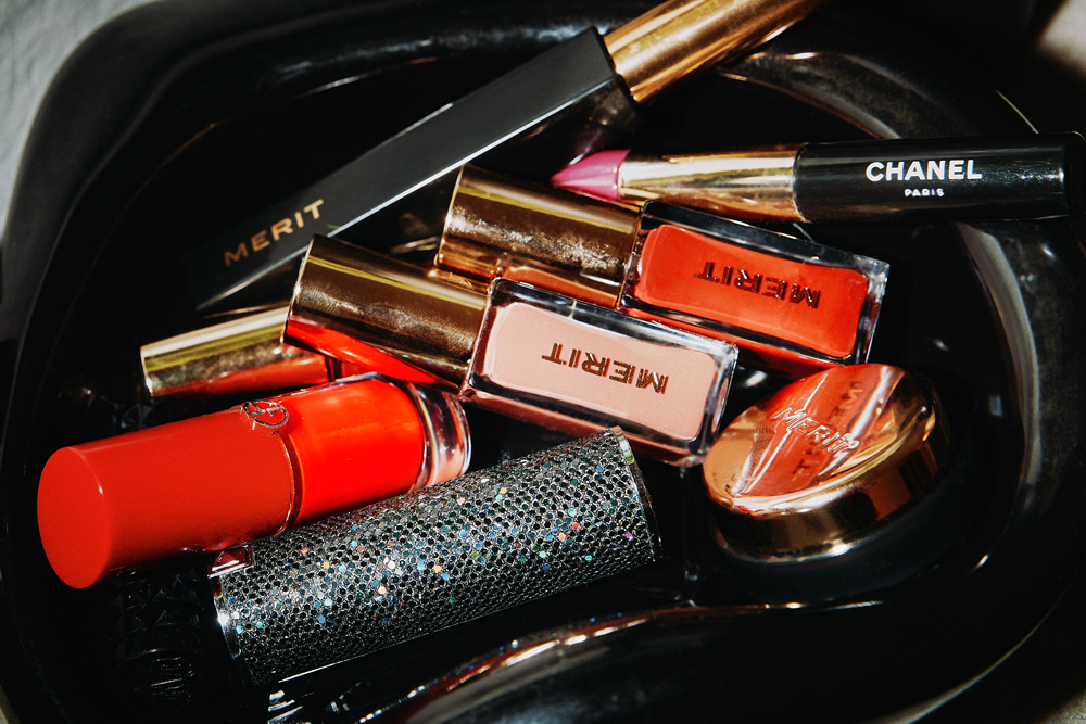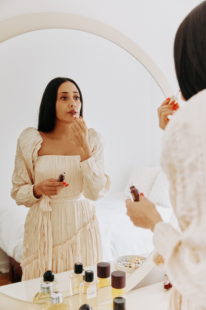 On an average day, I stick to my Lucas Papaw Ointment for my lips, or Gucci’s Hydrating Lip Balm in Joslyn Clair is great if I want an elevated lip balm. For color, I really like Merit’s Tinted Lip Oil in Falcon and Sangria—Sangria especially stains the lips for hours. My absolute go-to is Makeup by Mario’s MoistureGlow Plumping Lip Serum in Honey Glow. I have one in my errands bag and in my makeup bag; you’ll never catch me without one. Every once in a while, I love a red lipstick like Armani’s Lip Magnet Liquid Lipstick in Hollywood. Chanel has really good reds too. I feel like when I wear a Chanel red—I love the Rouge Allure Laque in Invincible—I’m always like, ‘Take a photo of this please. I need everyone to see.’