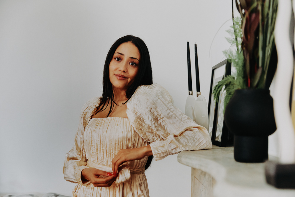 I have a very personal relationship with beauty through my mom, who is the beauty icon in my life. She always had big, curly hair—and now I love blowouts. She loves long red nails, and those are now my signature. She started dancing Mexican traditional ballet folklórico when she was five years old, so she grew up wearing makeup from a very young age. She still beats her face every single day, like cannot leave the house without her makeup. But when she had me, she wanted me to resist the pressure that she was under, so I wasn’t allowed to wear makeup until my senior year of high school. That’s a tough thing when you’re in it. [Laughs] I would put on mascara when I got to school in the morning, and then on the bus ride home, I would use wipes to take it off. At this point, I’ve learned what works for me and what I like, and so I’ve created a sort of uniform for myself. I keep it classic and then a little something—like a darker lip—if I’m going out.