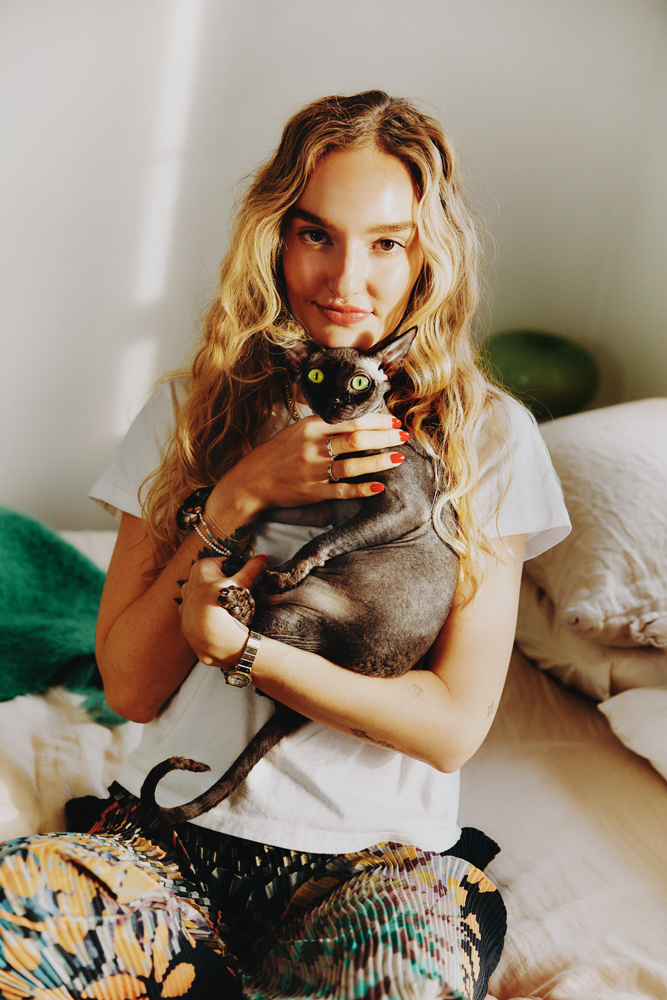 I feel the most myself with a lip. I hate to be such a cliche, but it feels very French to me to just have a bold lip with a bare face. Hermès’s lipstick in Orange Boite is a sheer-ish orange-red. It looks crazy in the bullet—like a carrot—but it’s perfect. Rouge Casaque is my bad bitch red. If I need to close a deal, that’s the one I’m wearing. Meanwhile, Byredo’s lipstick in Divorce is my sexy red. I love the whole Chanel Rouge Coco Baume line—the balms are super moisturizing. Dream is my flawless color. It’s a perfect burnt rosy—like your lips but better. Merit’s Shade Slick Tinted Lip Oil also has a beautiful formula.