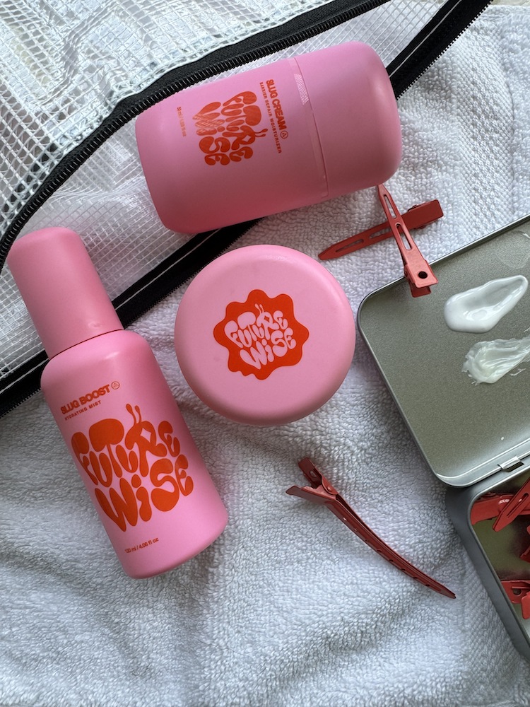 I started off the look with a lifting face massage to chisel her cheekbones and jawline. I always have the hotel bring up an ice bucket, and I keep a face roller in there until we’re ready to use it. I love the Futurewise Slug Boost Hydrating Mist and Slug Cream. Together, they really plump up the skin and create a beautiful base. They also give you a great slip for the face roller. I let them settle for a couple of minutes so her skin wasn’t too wet for the foundation.