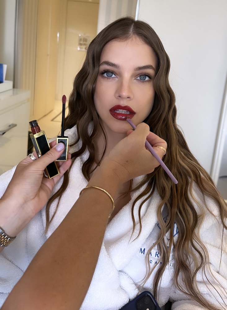 I was just in Cannes with Barbara Palvin! We’ve been working together for the last seven years, and this week I flew out to prep her for a couple of events, including a movie premiere yesterday. We built her red carpet makeup around a very vampy, ombre, glossy lip Barbara saw and loved, so we went for super clean, fair skin with a really light contour to let the lips shine.
