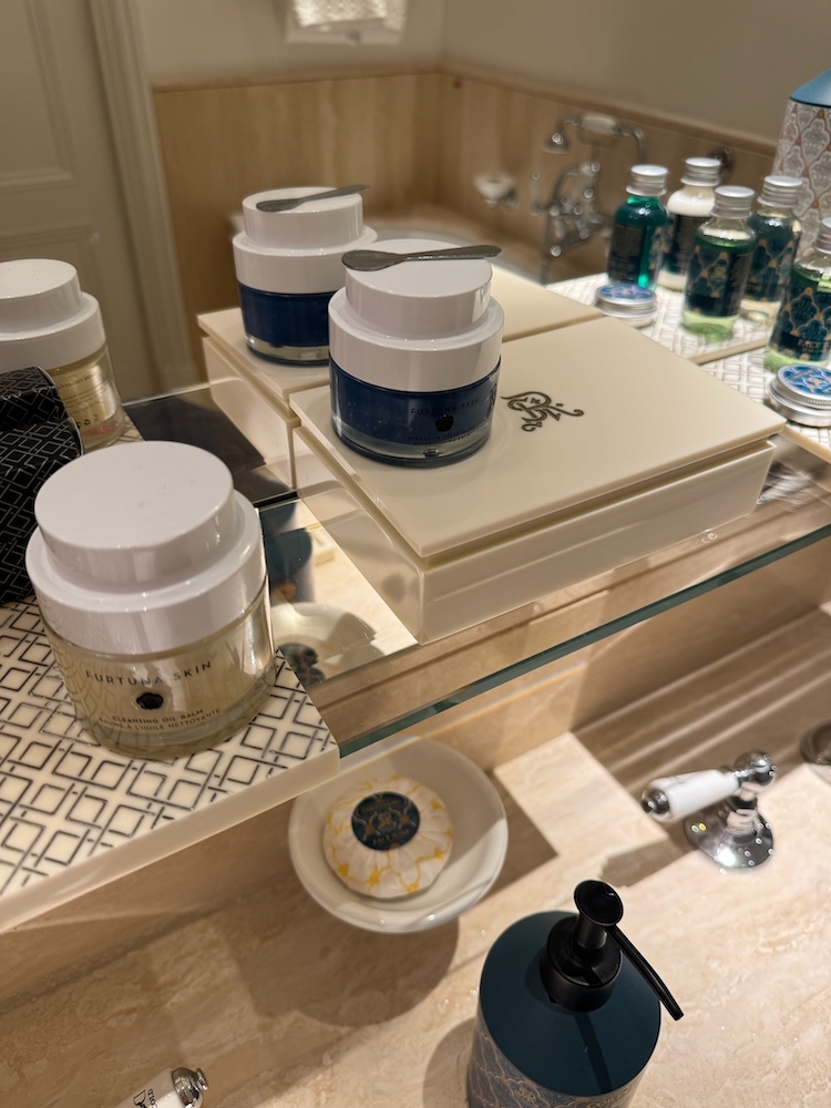 I always travel with the same four products from Furtuna—Acqua Serena micellar essence, which I especially need for the plane, Porte Per La Vitalità face and eye serum, Due Alberi biphase oil, and Rinascita delle Olive balm for an extra dose of hydration. To counter pollution in Rome and remove sunscreen, I triple cleansed with our Cielo Puro oil balm and micellar essence. At the farm, I added our Visione di Luce eye cream, Perla Brillante day cream, and Fior di Luna night cream because I had a little more time on my hands. Plus, after so much sunscreen application, I really needed to exfoliate with our Tesori di Seta exfoliator. A friend of mine recently gave me the Beauty of Joseon sunscreen. I took it with me to test out in Rome, and I didn’t burn. It’s nice and light. Even my kids, who hate putting on sunscreen, didn’t mind it. Makeup-wise, I’ve been loving Victoria Beckham’s Contour Stylus. I love how skinny and long it is. I’m an amateur makeup artist, and I appreciate how easy it is to blend out. Her Satin Kajal eyeliner and Vast Lash mascara are part of the mix, too. The Seafoam eyeliner is so fun, but I especially love the Gold Lamé shade for a night when I want a little shimmer. I love to make tinted oil by mixing our Biphase oil with Westman Atelier’s Illuminator Drops. It’s perfect if you don’t like wearing a lot of foundation like me. Westman Atelier’s Baby Cheeks blush in Chouchette is fantastic, too. And I wore Westman Atelier’s Lip Suede in Le Rouge one night. It’s very pretty and chic.