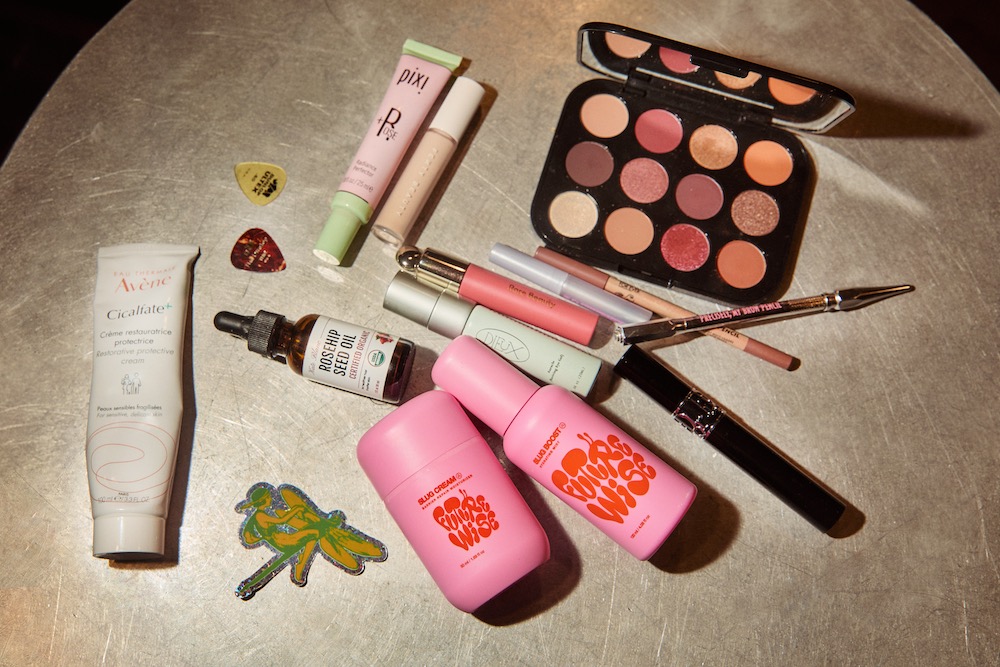 I’ve used Cetaphil’s gentle cleanser my whole life, and then I like to spritz my face with Futurewise’s Slug Boost. Honestly, who knows what a spritz does, but it feels nice. I’m like, ‘I’m awake!’ I discovered Avène’s Cicalfate cream when I did a skincare deep dive on the Internet during the pandemic. I get eczema around my nose, my eyes, and sometimes below my mouth, and this cream is the only thing that has ever helped. It’s very, very thick and a miracle product for me. Sometimes I’ll layer it with other moisturizers like Futurewise’s Slug Cream, which is a super light and really good daily moisturizer, or Farmacy’s Honey Halo, and if I do, the Cicalfate always goes on top. My eyes get kind of crispy—I know—and Dieux’s Auracle is the only eye cream that hasn’t made my eyes burn or flared up my eczema. It’s also nice to have eye cream on tour when I’m not getting much sleep. I seal everything in with Kate Blanc’s rosehip oil. It’s so cheap, lasts me around four months, and works so well. And I’ve been loving Iris&Romeo’s Weekend Skin SPF 50. Mineral sunscreens can be a pain because they can leave a white cast. I’ve also found that some mineral sunscreens are kind of smelly and sticky, but this one’s good. It has a slight tint, but it’s not overwhelming.