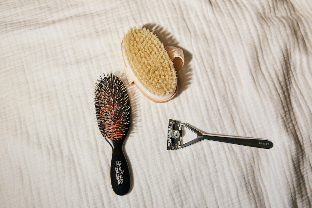 I think I’m going to keep my hair at this length for the rest of my life. I get haircuts with Jason Zeren at Spoke and Weal every three months, where we just thin out the back of my hair because it gets so thick. As far as products go, my naturopath recommended Nutrafol shampoo and conditioner because I was having scalp issues—I get dandruff when I’m stressed—and these products are apparently engineered with the microbiome in mind. I’m liking them so far. I don’t usually use a conditioner because my hair really holds on to it, but I keep it in my shower because sometimes I’ll put a tiny bit on my ends and rinse it out immediately. I’m more loyal to K18’s Molecular Repair hair mask. I’ve been using it for six years at this point, and I feel like my hair is stronger and grows faster. Recently, I started using Jupiter’s purifying mask once a week. It’s a charcoal mask that you put in before you shampoo. It’s very cooling. My scalp has gotten better with it—and it’s been a year-long process of trying to figure it out. Otherwise, I’ll throw on The Ordinary’s glycolic acid.