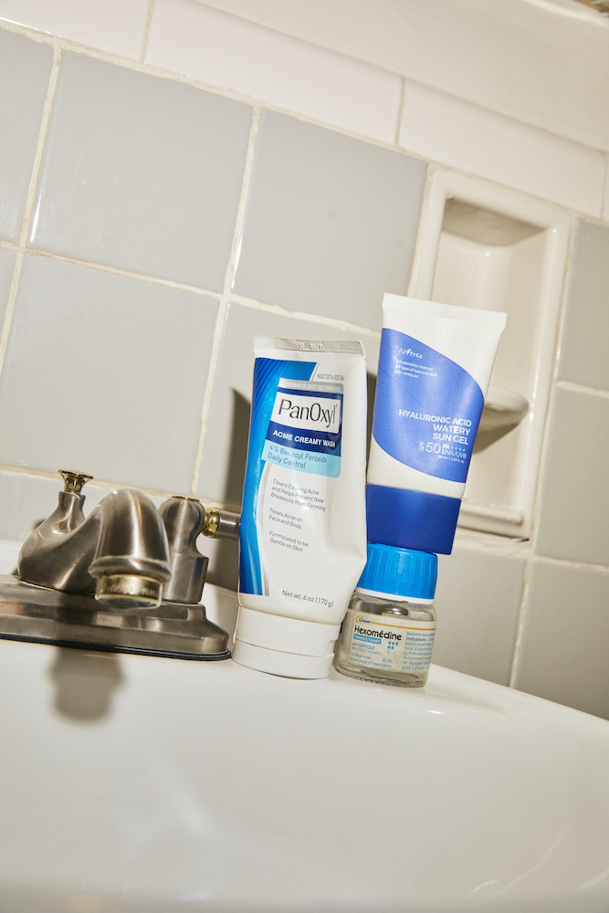 Do you remember the drying lotion from Mario Badescu? Hexomedine's Transcutaneous Topical Solution is sort of like that. It’s a French, liquid-y acne treatment. You dip a Q-tip in it and then you put it on the pimple to dry it. This one dries clear though—I’ll put it on overnight and it usually helps diminish the size. And then Up&up’s benzoyl peroxide gel is my poor man’s version of the Sofie Pavitt benzoyl peroxide mask. I use it maybe four times a week because I’m not using tretinoin or anything else like that, so it helps keep my skin clear.