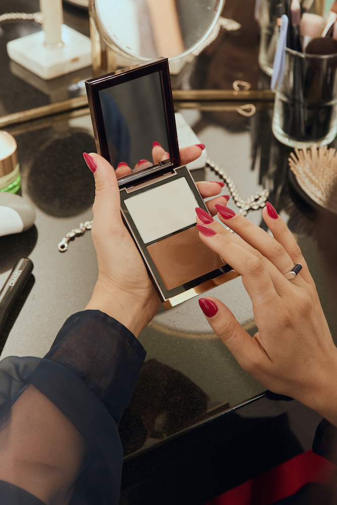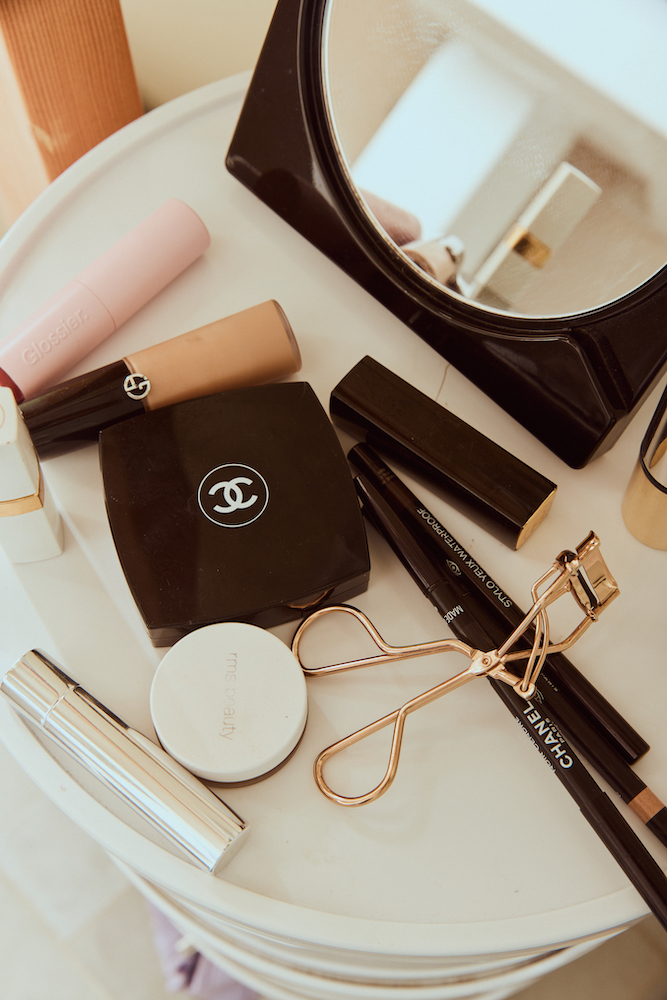 I love a shiny eye, and I’ve been using Chanel’s multi-use glow stick in Golden Light for years. I have multiples—it’s that perfect. It gives you this kind of ‘wet’—not shiny—and bronzy look. You need so little, so you don’t end up with a goopy feeling on your eyes. And then the Les Filles en Rouje eyelash curler is the best for my eye shape—and it doesn’t pinch me. I follow that with a swipe of Chanel’s Inimitable mascara. It’s dramatic, but it’s not too heavy—it leaves the right amount of product on the lashes.