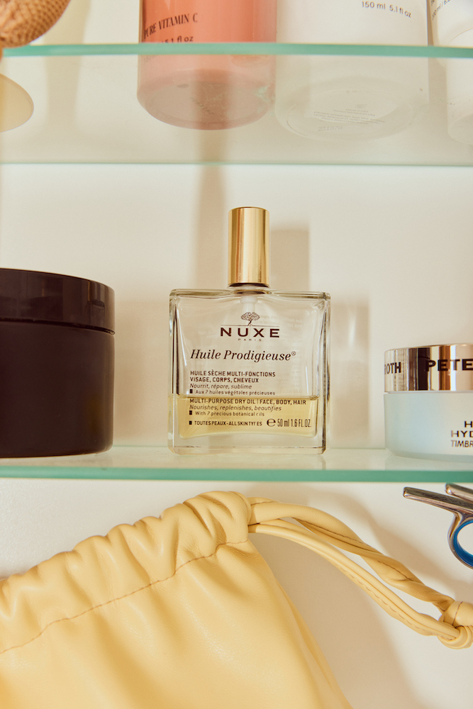 As for perfumes, there are very few that I can live a full day in. I think the issue is that I’m extremely picky. Even if I like a perfume when I first smell it, once I put it on my body, I’m like, ‘Get it off me.’ That said, I’ve worn Molecule 01 for years. I don’t really smell it on myself, but if I spray it on a shirt, I find it intoxicating. It’s not unlike Glossier You, which I also find really subtle. I’ve worn it forever, too. I love Nuxe’s Huile Prodigieuse dry oil because it’s so multi-purpose. Is your skin dry? Put it on. Want to smell good? Rub some in. I picked it up from my grandma, who wears it every day.”