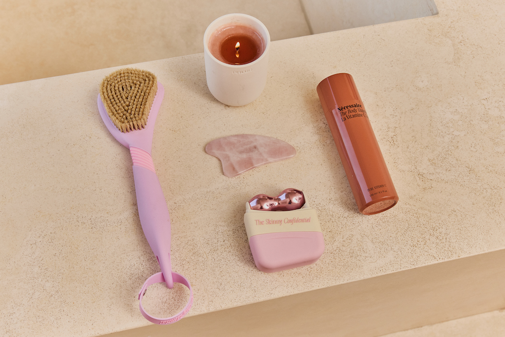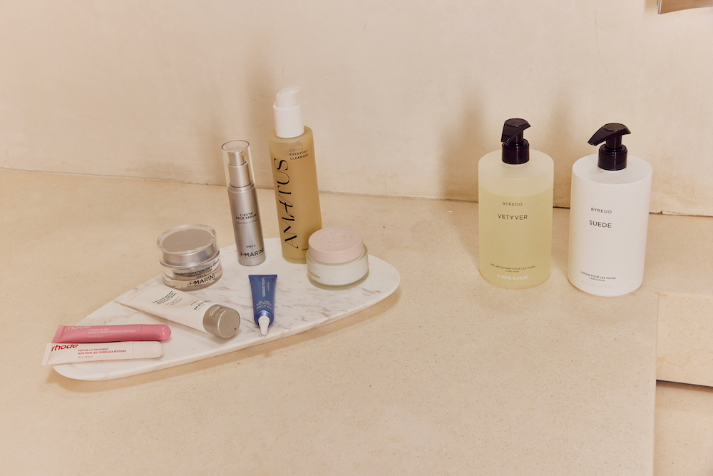 Every other night, I cleanse with Jan Marini’s Bioglycolic cleanser, but my skin can get a little sensitive with it so I like to alternate it with Image’s Ormedic. I dry my skin with Clean Skin Club’s face towels and then use my Dr. Dennis Gross LED mask for six minutes—three minutes with the red light and three minutes with the purple light. I pick my skin and using it has been a great way to calm down my breakouts before I can get to them. Sharlena told me Jan Marini’s Regeneration serum would dramatically change my skin, so I use it every night. Then I apply a tiny layer of the Bioclear serum, which is glycolic acid-based, and my Transformation cream. If I have a pimple, I might spot treat it with her benzoyl peroxide lotion. If not, I’ll swipe on Rhode’s lip treatment and go straight to bed.