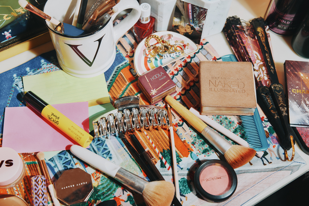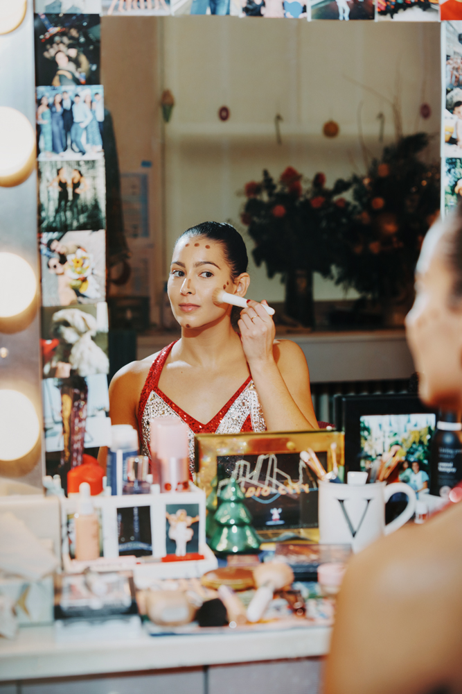 Every Rockette has a unique way of doing their makeup and hair. I had to experiment a lot during my first year because other than wearing a red lip and false lashes, you get free rein. I start with the Wet N Wild primer serum. It leaves my skin so dewy, which is nice because I use a lot of pressed powders and I don’t want my skin to look too matte. Then I dab a little bit of the Hero Cosmetics Rescue Balm on small spots—it’s green so it neutralizes the redness under my foundation—before going in with Tarte’s Shape Tape concealer in 29N and the Haus Labs Triclone foundation in 200. I bring it down to my neck, too. It really covers a lot without being cakey. Someone once told me that the higher you place your contour, the better, so I put the Hollywood Contour Wand from Charlotte Tilbury a little bit above where I want to create shadows. I set it with Benefit’s Hoola bronzer, and I like to use my One/Size setting powder to accentuate the lighter sides underneath my cheekbones, just above my jawline, and my nose, too.