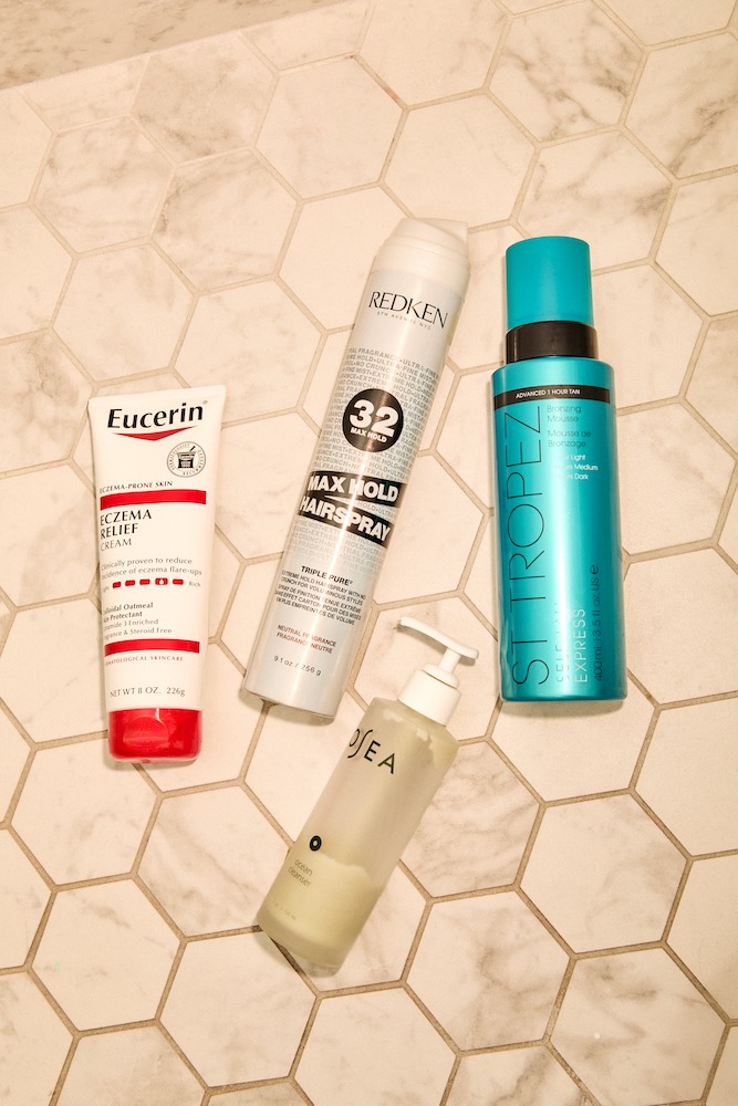 I wash my hair almost every day, but if I wasn’t on set all of the time, I would wash it twice a week. I love the Pacific Salty Wave shampoo and conditioner. They’re my secret find. A bottle of each is only $10. They don't have sulfates or parabens, but the shampoo still lathers, which is important to me because I don’t feel like I actually washed my hair otherwise. And the saltiness gives my hair great shape and volume. For styling, Redken’s Max Hold is the best. I love the nozzle because it sprays in a triangular mist, so it’s not too aggressive. And the ends of my hair really love the Badger herbal oil. It smells like almonds, which honestly is probably what really gets me.