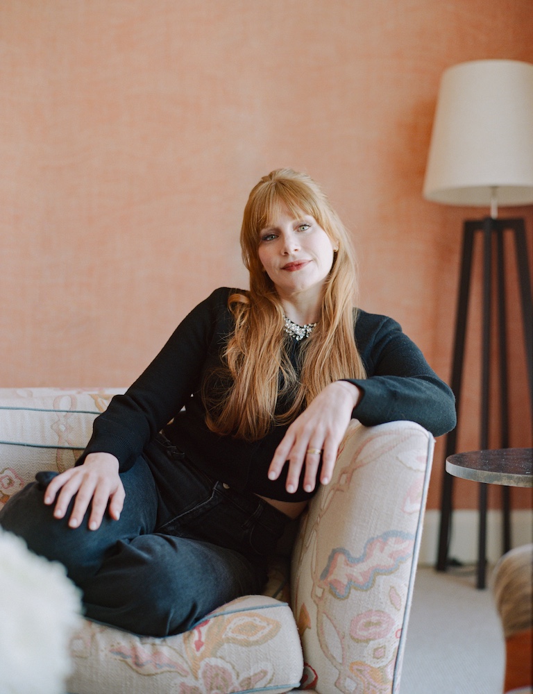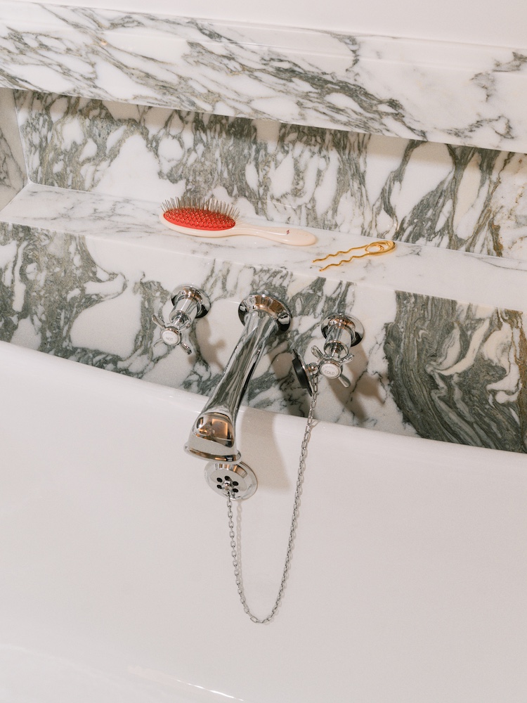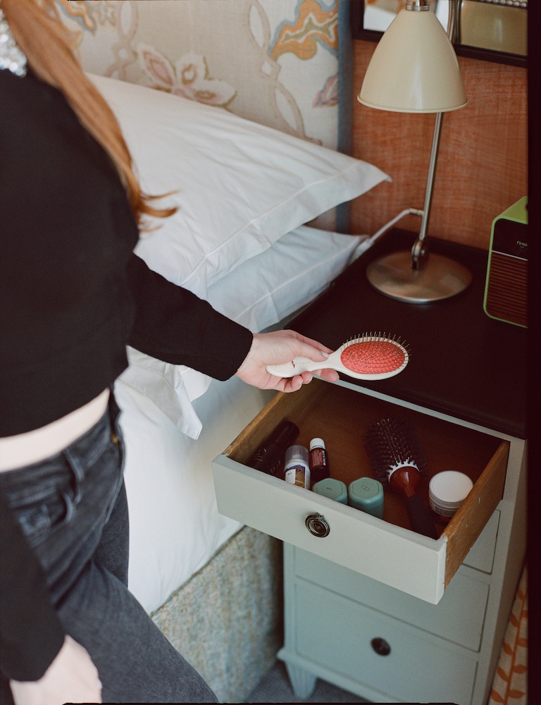 Adir Abergel, who’s an amazing, amazing hairdresser, did a collaboration with Lelet. The collection included a metallic O pin that I love so much. I have really long hair, but it’s so easy to keep it up with the pin. Overall I don’t really do much to my hair. Every once in a while, especially when I’m working and I have the discipline, I’ll use a shampoo like the Davines Alchemic that’s specifically made for copper hair. And then I love R+Co’s Badlands dry shampoo paste.