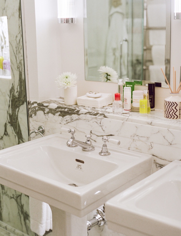 At night, I always double cleanse. I’ve been using Benefit’s POREfessional foaming cleanser and cleansing oil for a while now, and they’re great for travel too. If I’m wearing eye makeup, I’ll start with Bioderma micellar water to break it down. Then in the morning, I’ll just use a Clean Skin Club towelette with water. Easy.