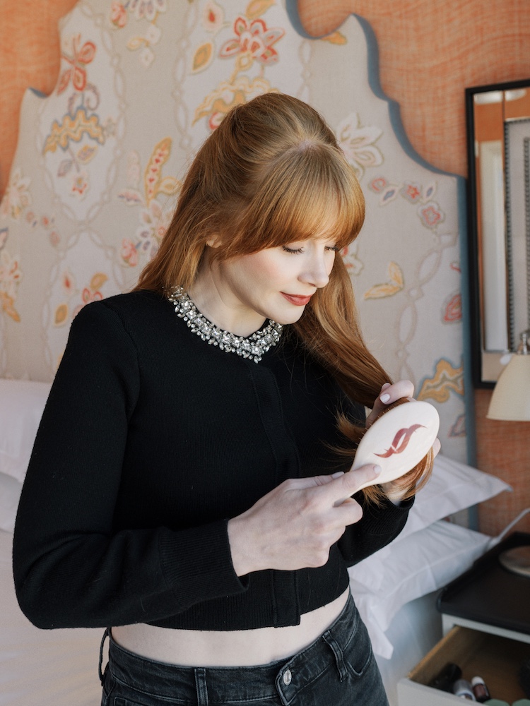 What I’m really passionate about is my Sheila Stotts brush. It powers through tangles so easily. My hair can get frizzy, but when I use my brush with a Shark hair dryer, it ends up very, very smooth. It’s amazing. By the way, the Shark dryer is amazing, too. I was doing press in Toronto and I worked with a hairstylist named Janet Jackson—for real—and she actually gave it to me. It’s perfect for traveling because it’s so compact. My daughter steals it all of the time.”