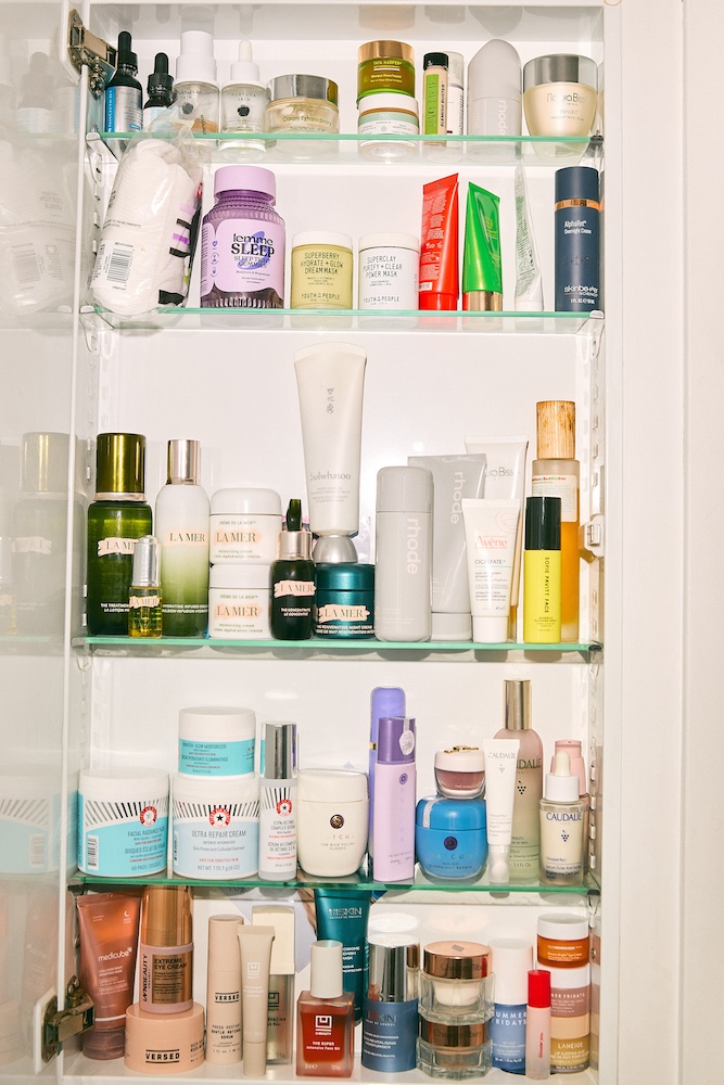 Next, I moisturize. Rhode’s Glazing Milk is my ride or die. If you’re traveling and don’t want to pack a lot, it’s a quick hit. It’s deeply hydrating so you can use it as your moisturizer, but it’s also a great base for makeup because it ‘sticks’ on your skin and doesn’t absorb fully right away. On the heavier side, Crème de la Mer is a classic. Recently though, I went through a whole tub of MBR’s Cream Extraordinary. I know it’s $450—absurd—but one of my clients recommended it and I was literally scraping the bottom of the tub to get every last bit. It’s very, very thick, but it doesn’t move at all during the night so you have lasting hydration throughout the day. I think it’s worth the investment—the operative words being ‘I think.’