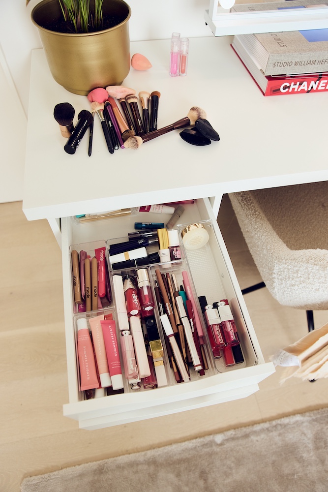 My lip collection is probably the biggest part of my makeup collection because that’s the one area where I feel comfortable experimenting. I love stains. Huda Beauty’s is not a peel off, but it stays on your lips for a while. Soft Nude and Baby Pink are my go-tos. Her Faux Filler oils are also amazing with their super glossy finish—I have Peach. Somehow, Fenty’s Gloss Bombs are even glossier. I probably have 30 tubes of Hot Cherry—it’s the one I make every girl try if I’m in a club bathroom or something. I’m like, ‘Put it on right now.’ [Laughs]