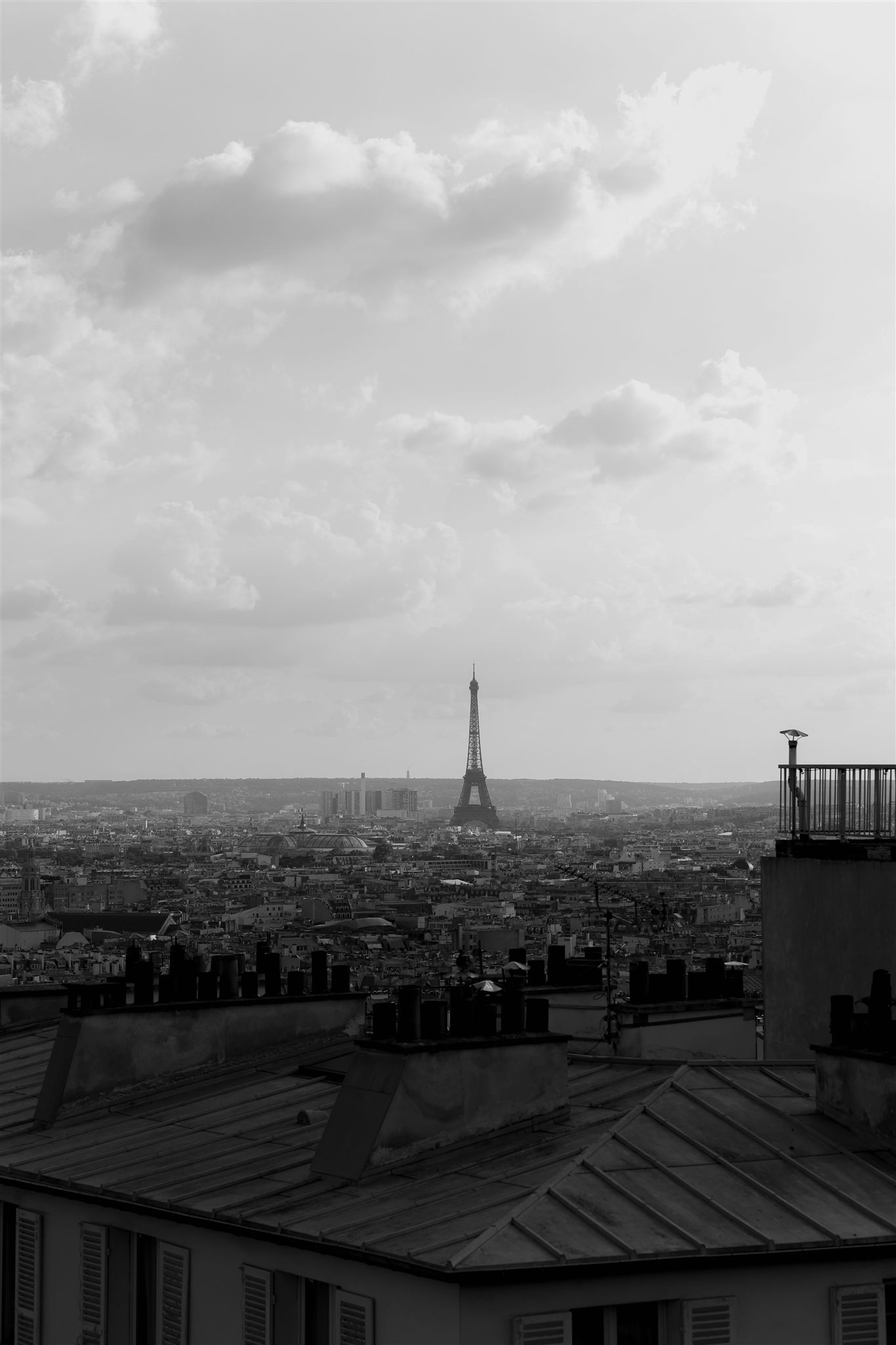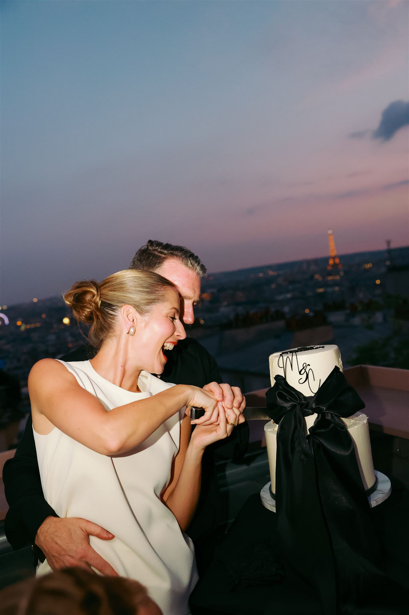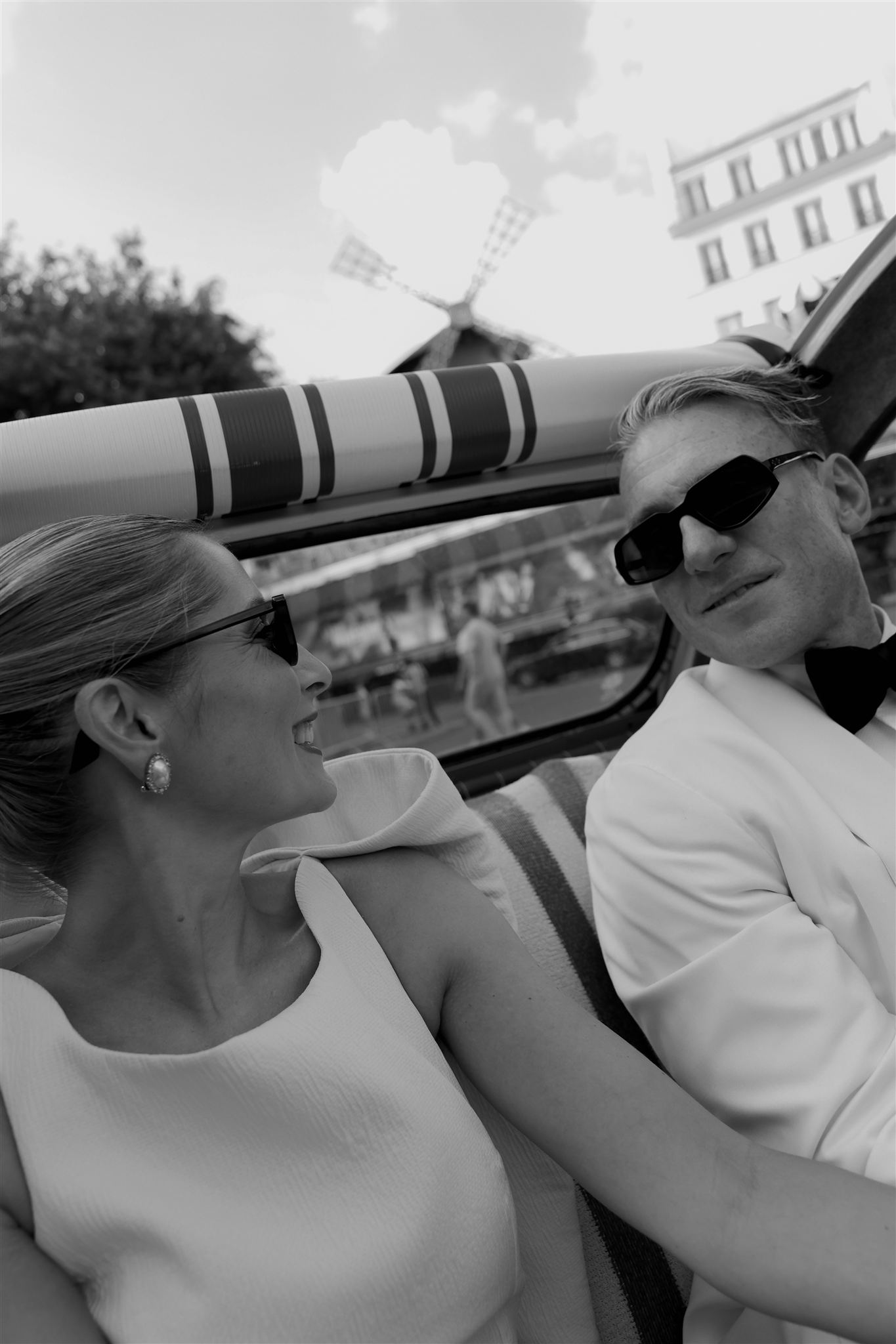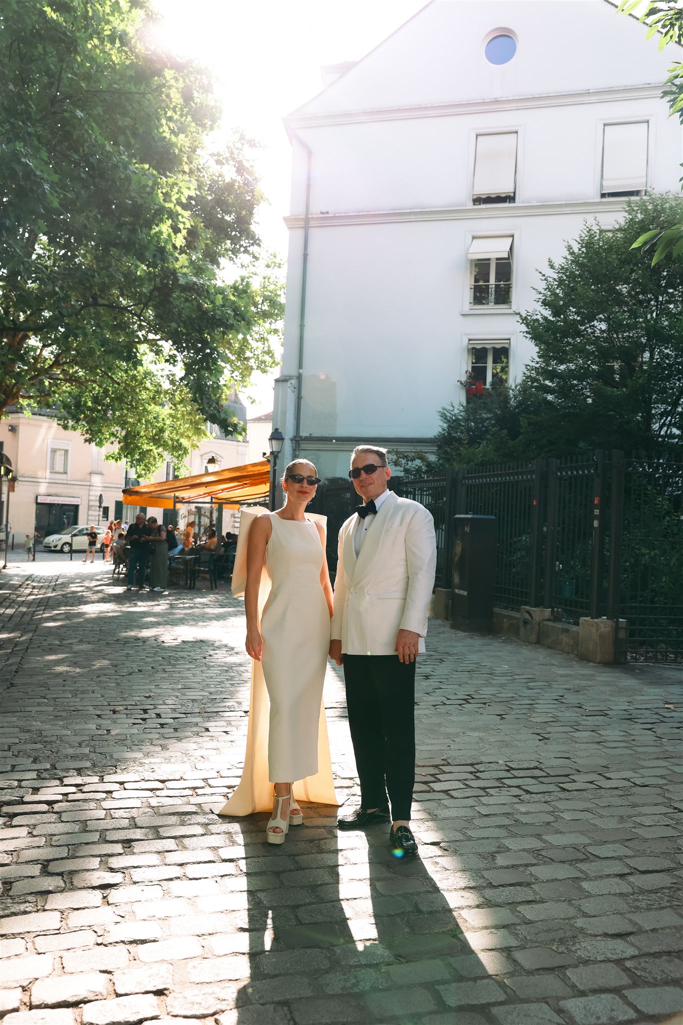 We chose Montmartre for its village vibe. I hired a planner to help with the language barrier and bring my “non-wedding wedding” vision to life. I told her, “I hate weddings. No round tables, no favors.” She delivered. The ceremony was held at the Museum of Romantic Life, a gorgeous old building with gardens and Parisian rooftop views. From there, two little white petit trains ferried guests to the reception at a coffee shop halfway down the Sacré-Cœur steps—when she pitched it to us, our wedding planner said, “I’ve got something slightly controversial.” The upstairs space was a blank canvas with a terrace that overlooked both the basilica and the Eiffel Tower. It was absolutely magical.