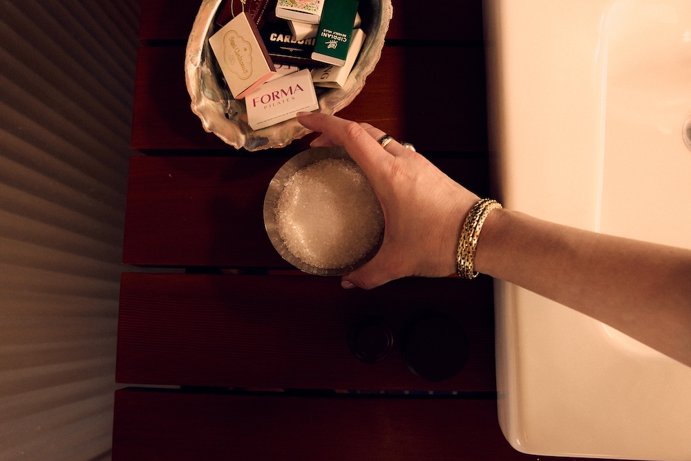 My baths always include a few favorites. Susanne Kaufman makes a great bath soak. I discovered it at Ett Hem, a hotel in Stockholm—and one of my favorite hotels ever because every detail is so considered. The sprig of rosemary in the bottle elevates the soak, but beyond that, it’s antibacterial so it helps clear up blemishes on your body. I mix it with SaltWorks epsom salts. Neither bubbles up, but the combo makes me feel like it’s the grownup version of a bubble bath. Don’t get me wrong, I love bubble baths, but I get worried about UTIs. [Laughs]